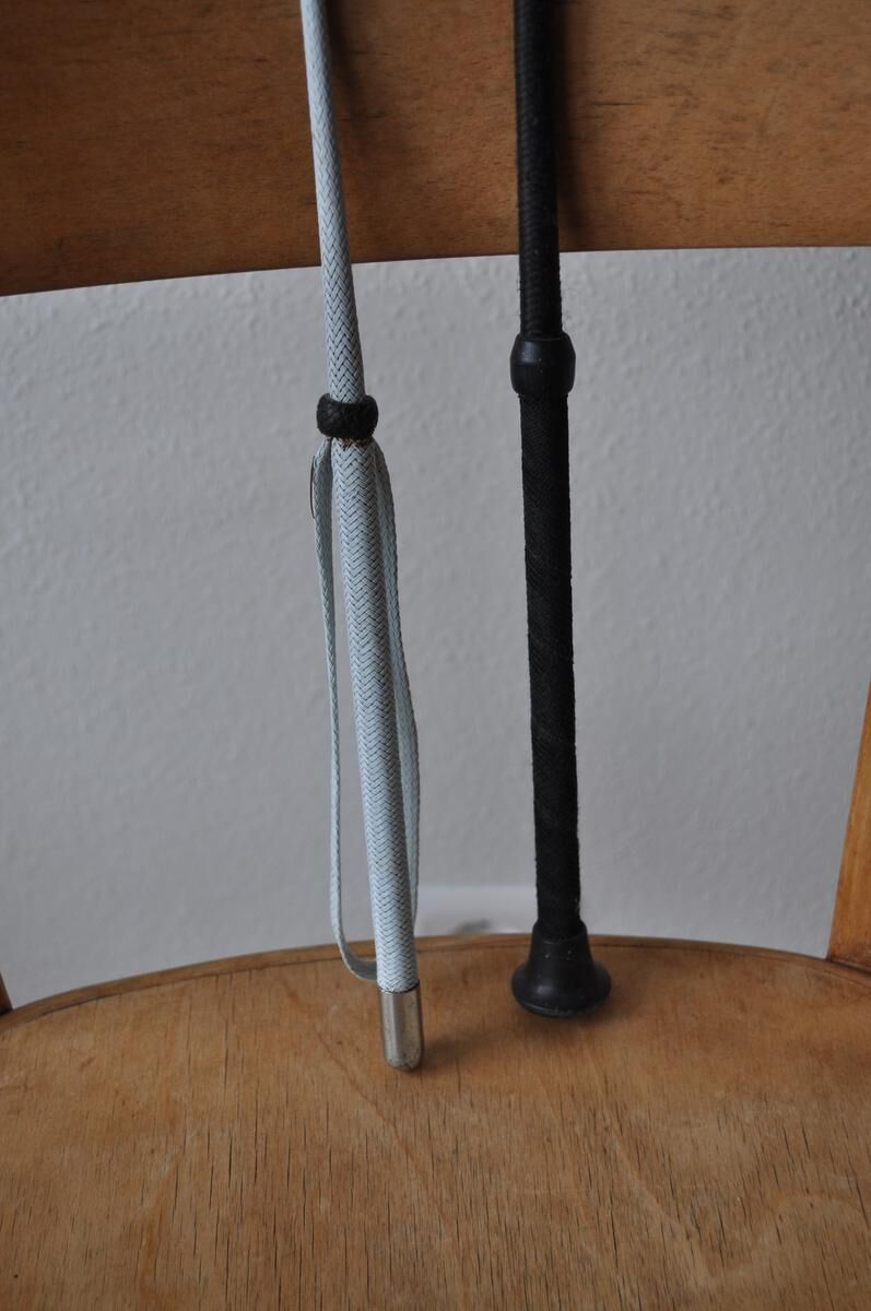 2 cravaches saut : noire 65cm bout en cuire + bleu-ciel 65cm.