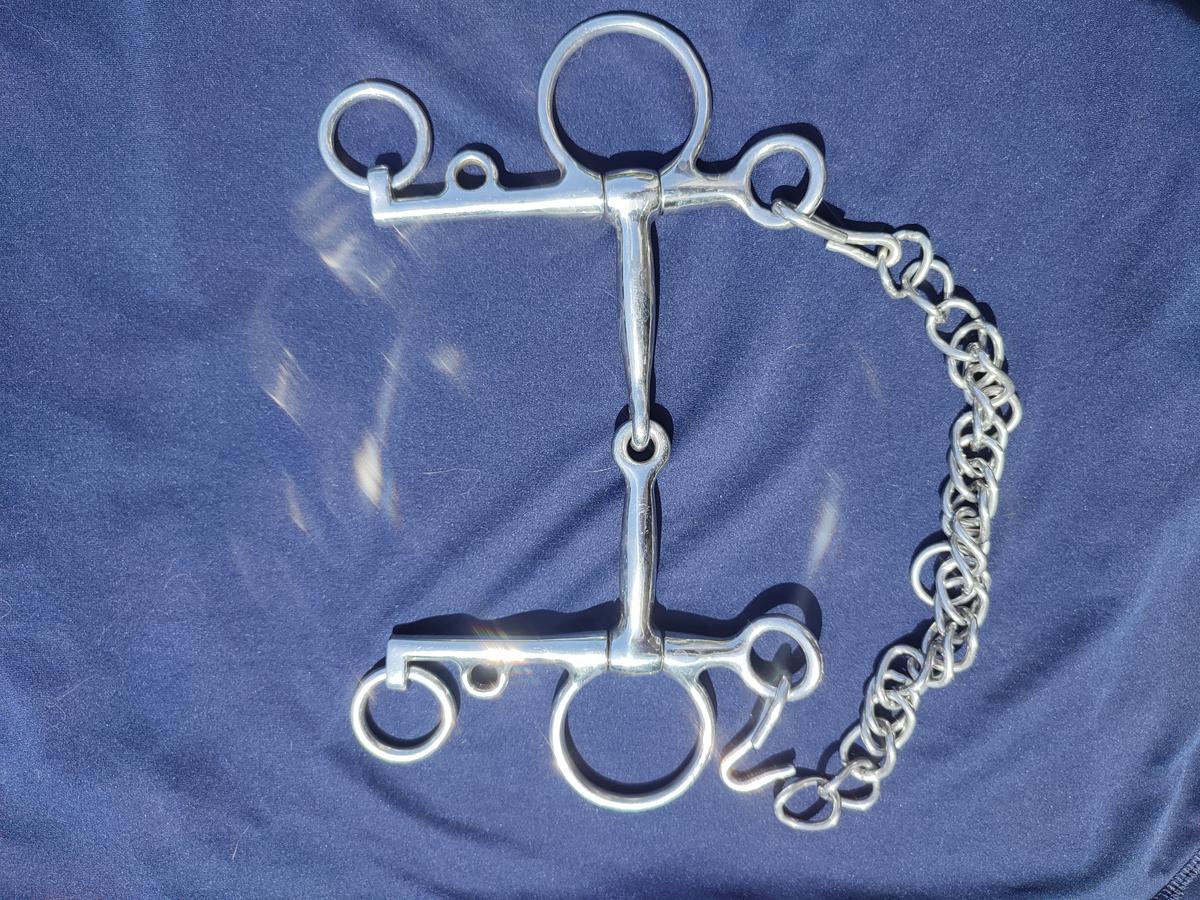 Vends un mors pelham simple brisure en inox en taille 125mm en très bon état. Il est équipé d'une gourmette.
