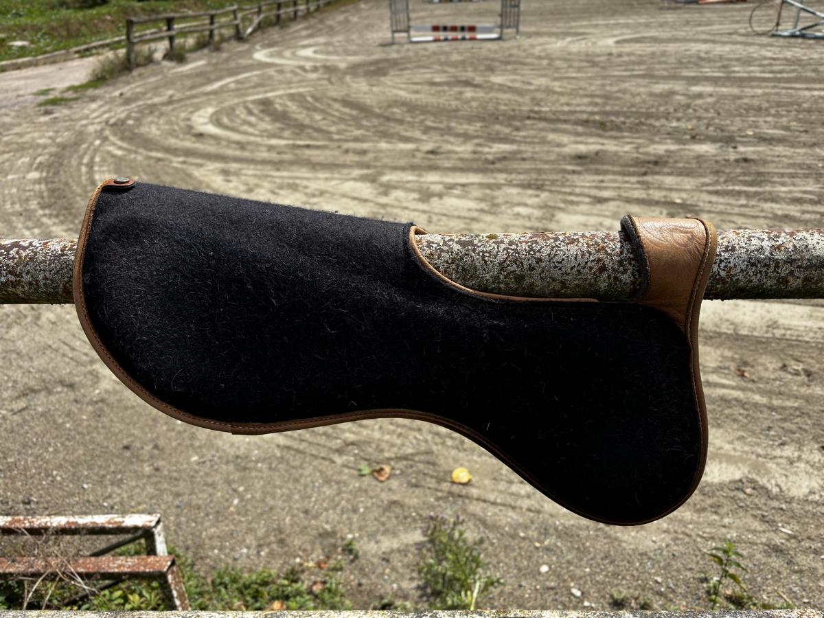 Je vends un amortisseur en feutre de la marque Bruno Delgrange. Il est noir avec des contours en cuir et un dessous gris. Il a la particularité d’avoir des cales arrières. Il a été utilisé à peine une dizaine de fois. Cause de la vente : changement de selle. Prix neuf : 305€