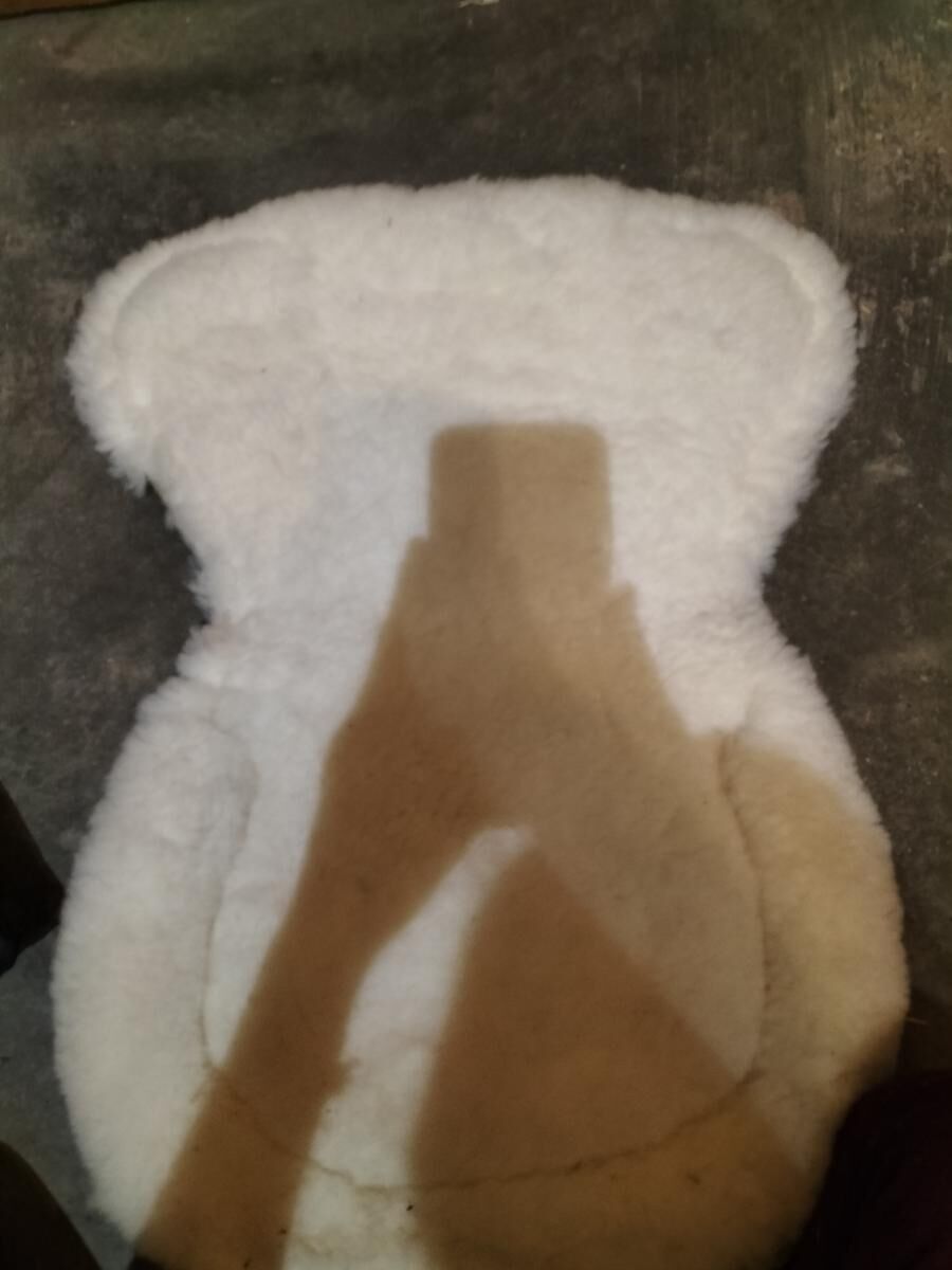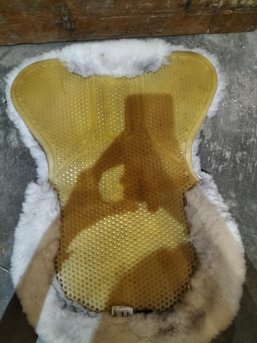 Amortisseur blanc fouganza taille cheval avec quelques tâches noires sur la moumoute