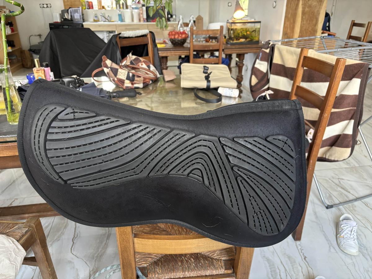 Amortisseur mémoire de forme, le silicone se décolle à certains endroit mais utilisable en l’état. Taille L, passe sous les selles 17,5. un peu lourd.