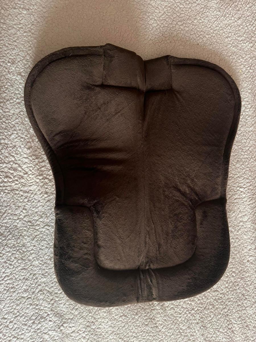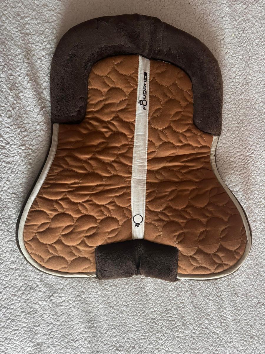 Amortisseur en fausse fourrure de couleur camel et marron. Très peu utilisé. Propre et pas abîmé. Taille Cheval. Marque Fouganza. Peut avoir présence de reste de poils.
