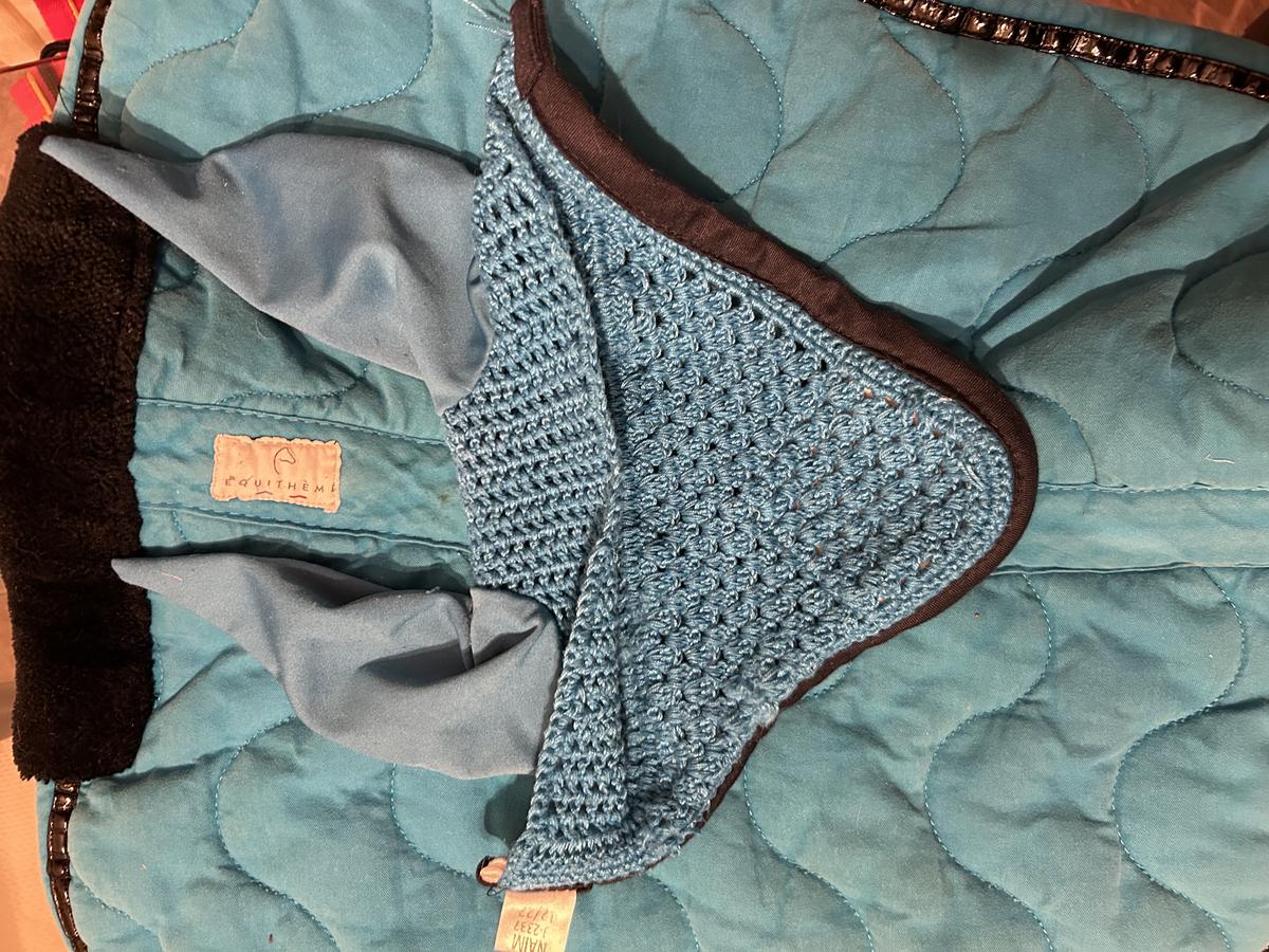 A vendre amortisseur plus bonnet taille cheval bleu électrique peu servi car la couleur ne plaisait pas :) l'ensemble est nettoyé et n'est pas dissociable.