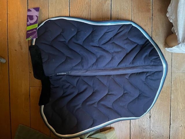 Amortisseur Equithême neuf, avec étiquette, bleu marine et liserais bleu ciel et blanc.