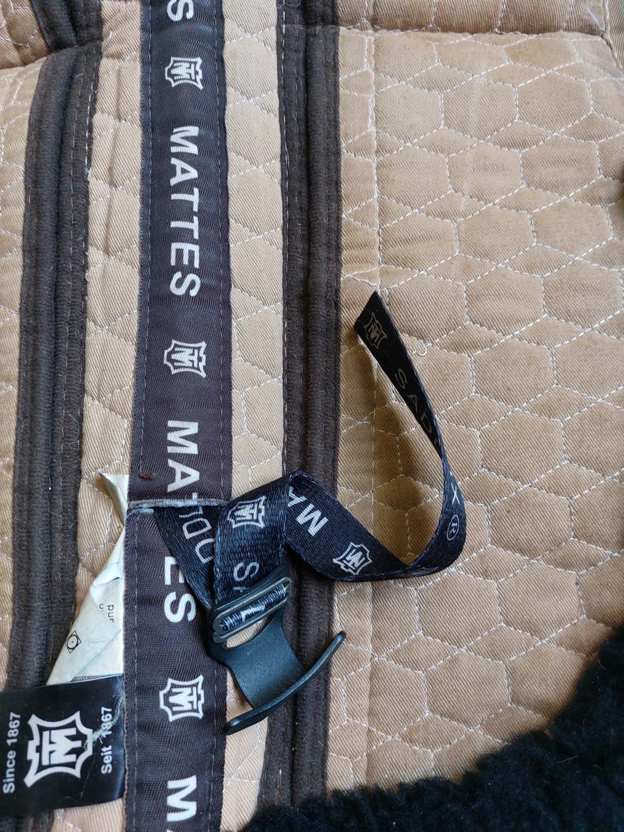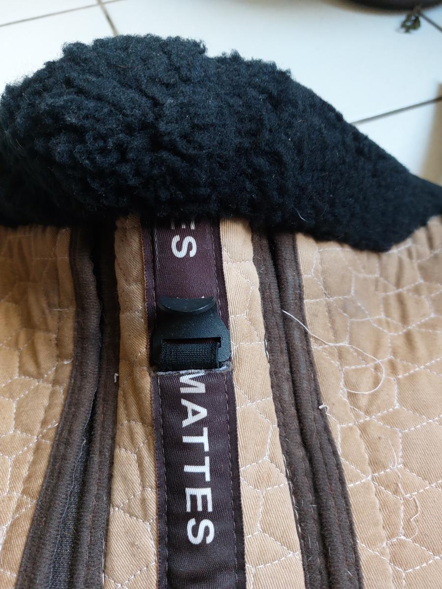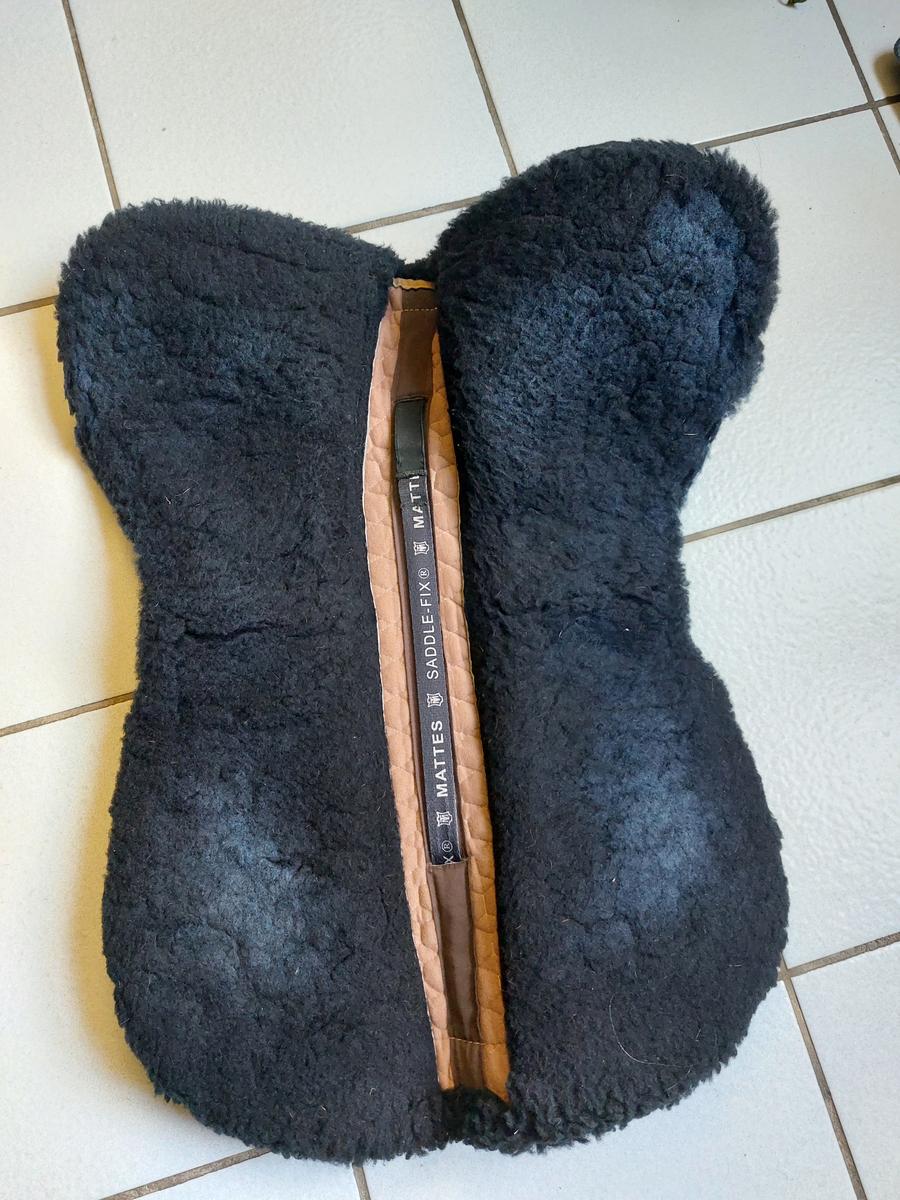 Amortisseur couleur noir et sable de la marque MATTES en laine avec système de correction avec des cales qui peuvent se mettre à l'avant et l'arrière de l'amortisseur afin de répartir le poids de la selle ainsi qu'un système de saddle fix qui permet d'attacher l'avant et l'arrière de l'amortisseur à la selle et permet ainsi de ne pas compresser la colonne vertébrale du cheval.