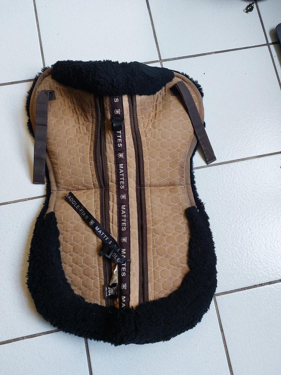 Amortisseur couleur noir et sable de la marque MATTES en laine avec système de correction avec des cales qui peuvent se mettre à l'avant et l'arrière de l'amortisseur afin de répartir le poids de la selle ainsi qu'un système de saddle fix qui permet d'attacher l'avant et l'arrière de l'amortisseur à la selle et permet ainsi de ne pas compresser la colonne vertébrale du cheval.