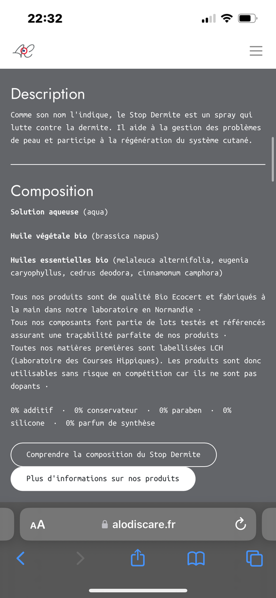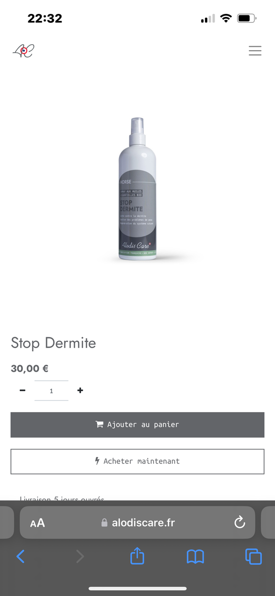 Spray Stop Dermite neuf de chez Alodis Care. Jamais utilisé, car finalement le problème n’était pas dû à une dermite. Produit reçu en avril 2023.