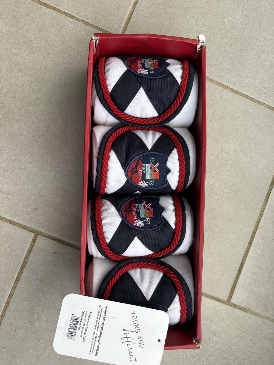 Bande de polo HKM blanches et bleues, jamais utilisées encore avec étiquette.