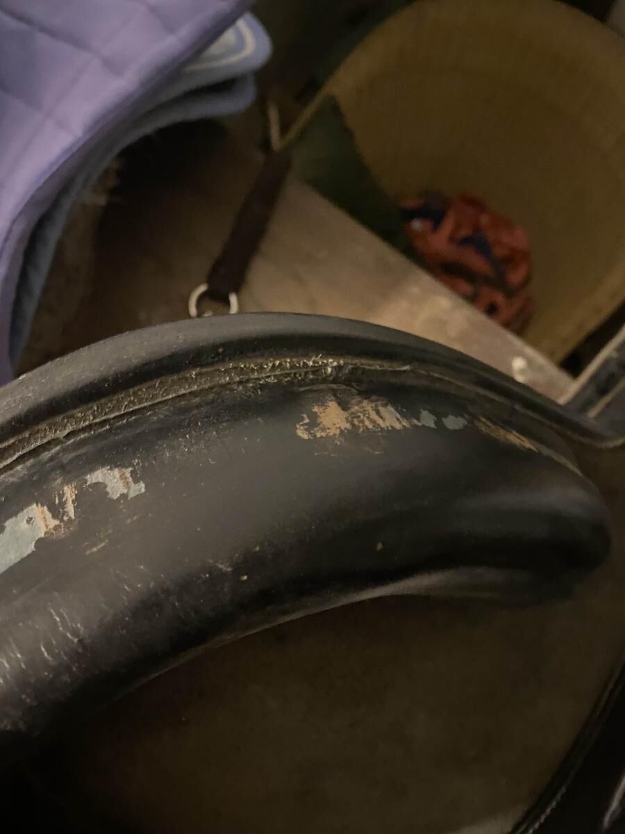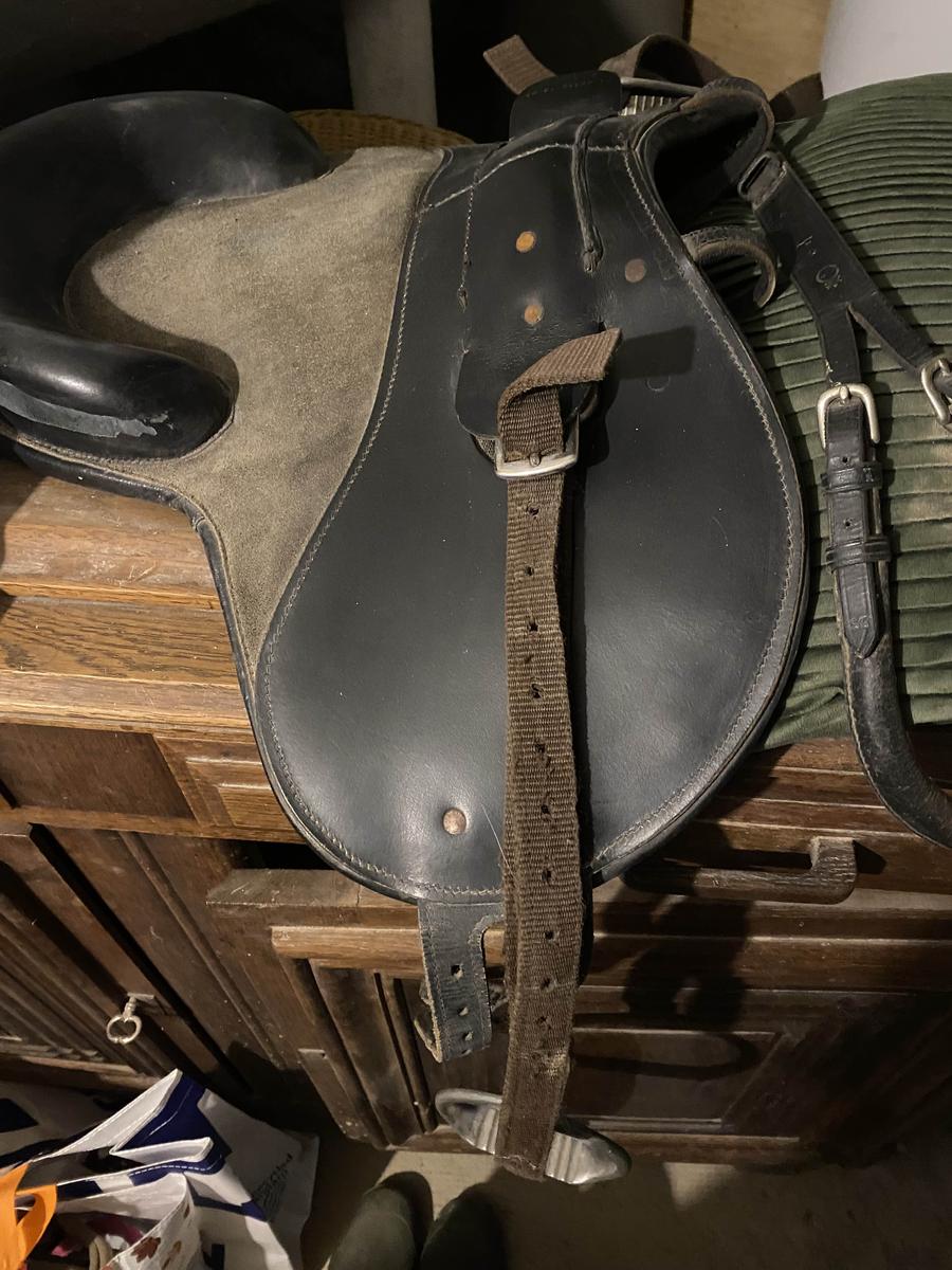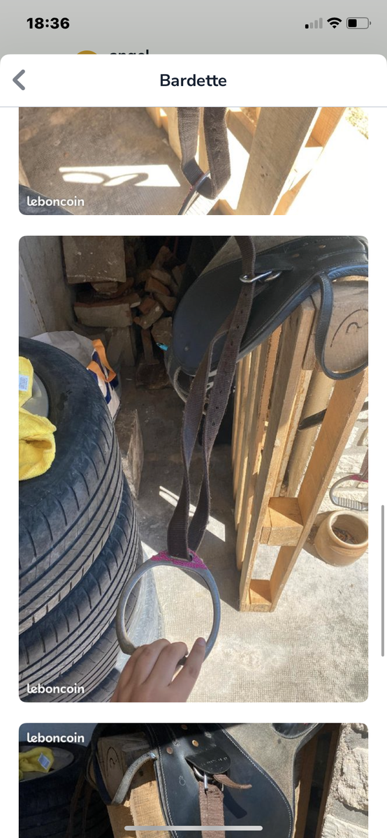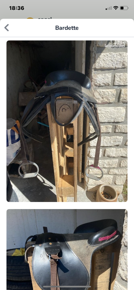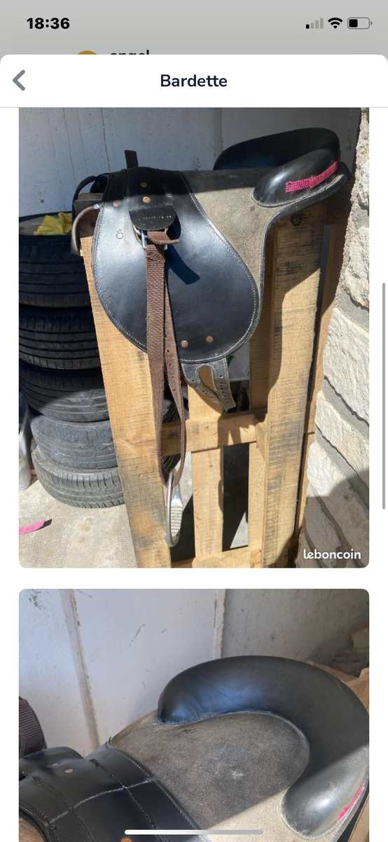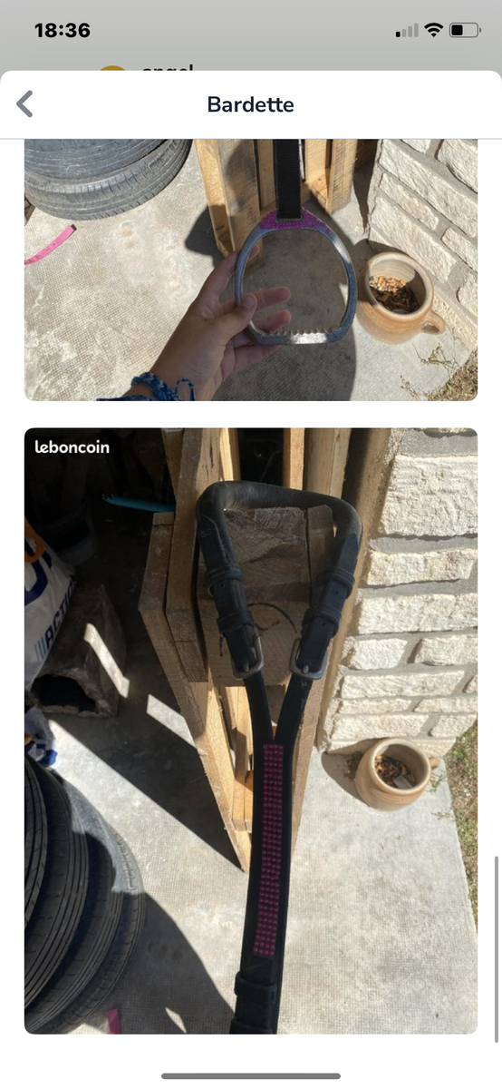 bardette avec étrivière et étrier (les strass roses n’y sont pus mais malheureusement quand je l’ai ais enlevé ça a arraché un peu sur l’arrière mais elle reste utilisable et en bonne état jamais utilisé acheté d’occasion)