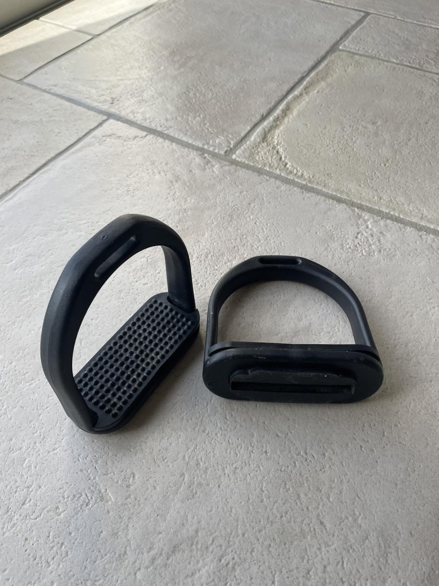 Equipée d’étrivières cuir marron et d’étriers plastiques taille enfant.
