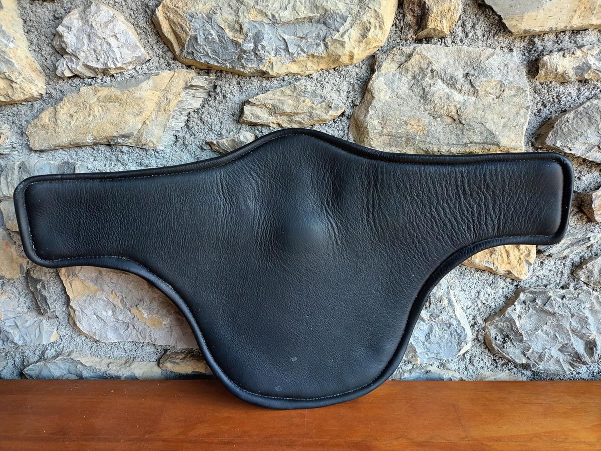Bavette pour selle monoquartier, réalisée par artisan sellier Sellerie de la Côte Basque. Utilisée trois fois. Cuir noir de très bonne qualité. Largeur maximale : 34 cm. Longueur : 62 cm. Élastique couleur bleu marine. Prix neuf: 180€