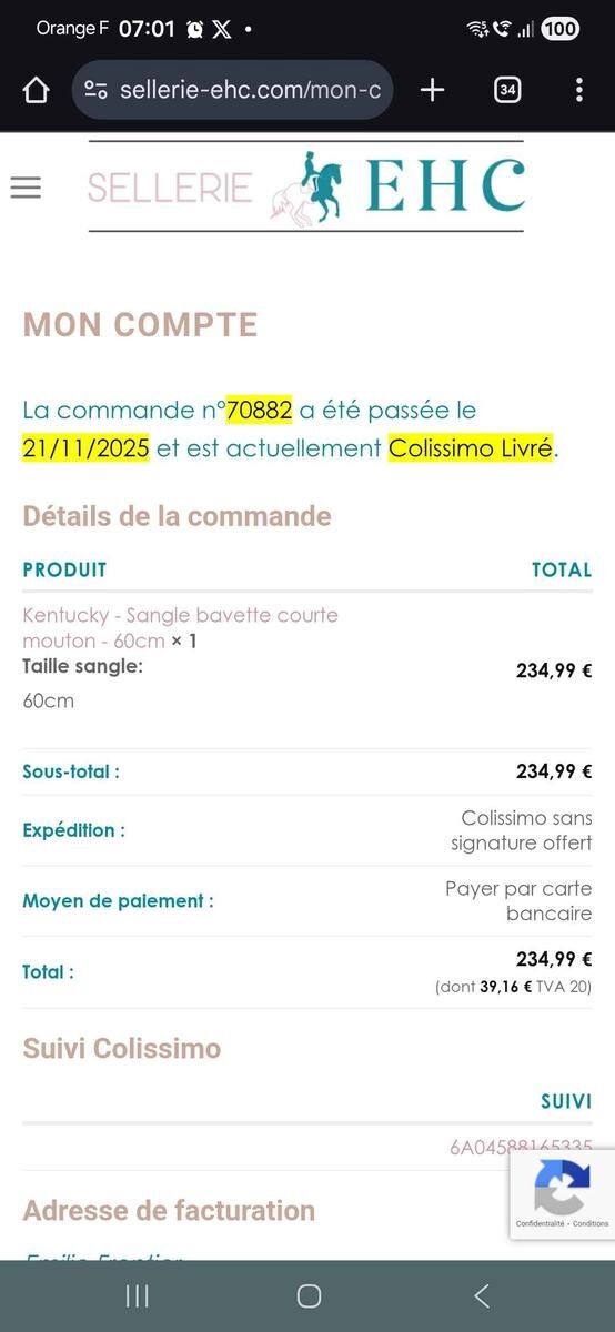 Achetée le 21/11/2025 en sellerie – facture en photo.