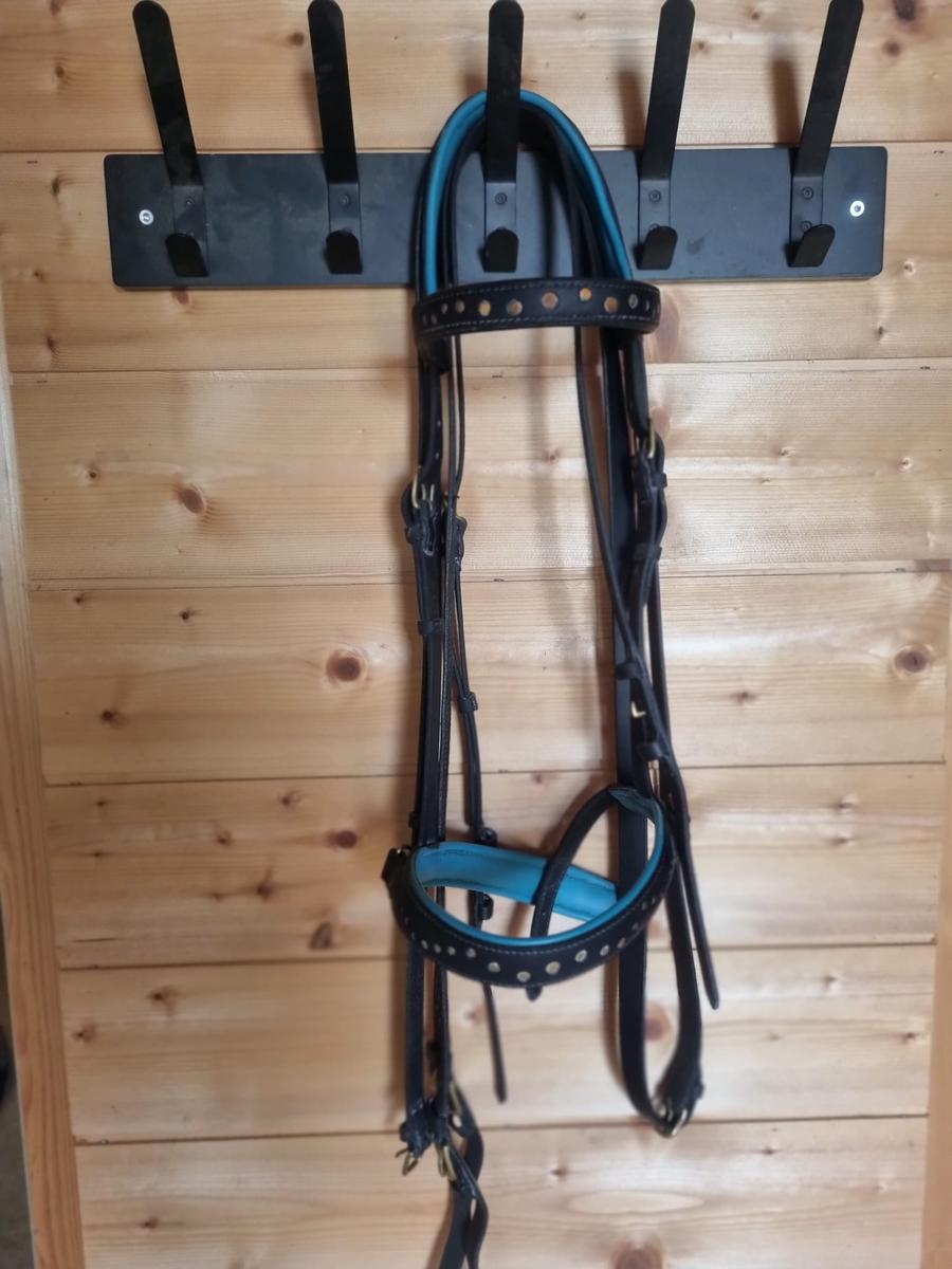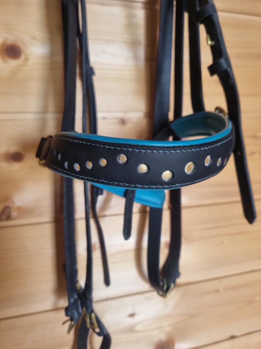 Matelassure têtière et muserolle en cuir bleu, motifs incrustés en cuir doré