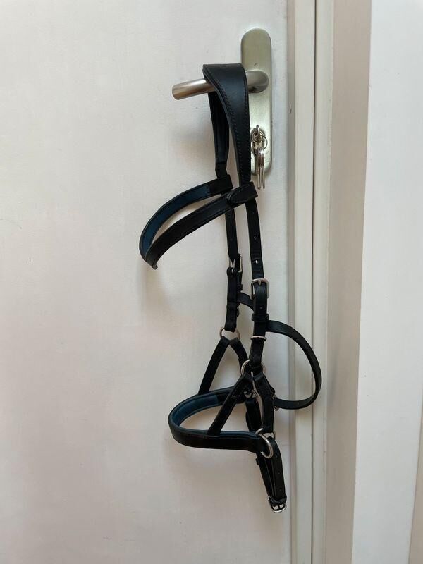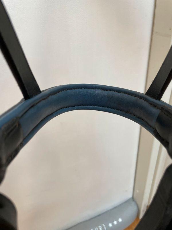 Je vends mon side pull en cuir noir intérieur bleu sur la muserolle et le frontal taille cheval.