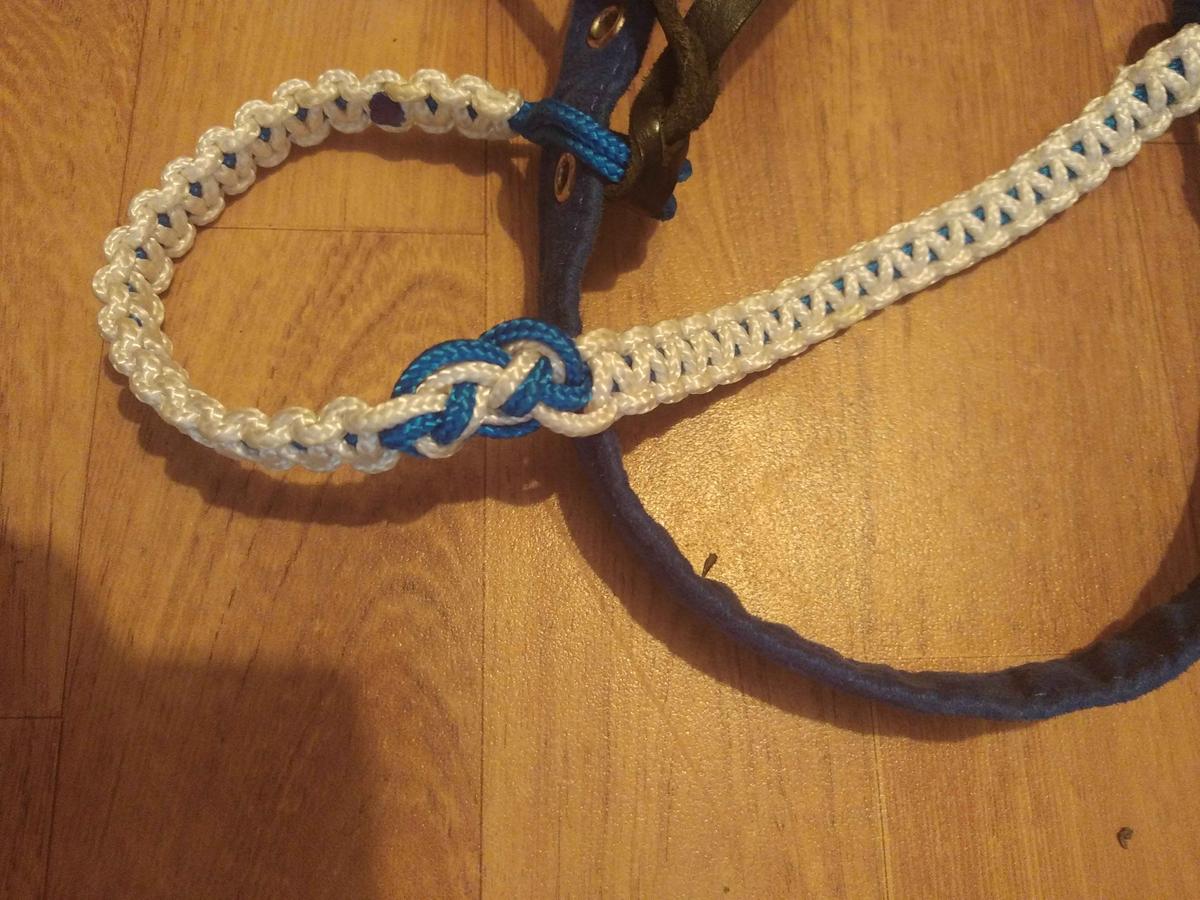 Fait main a partir d'une muserolle. Malheureusement, la dite muserolle est trop petite pour mon poney, il a une grosse tête. Donc taille grand poney ou petit cob, suivant la taille de la tête. Sous auge a la place de la sous gorge. Frontal de Breizh etho. Side pull en suédine
