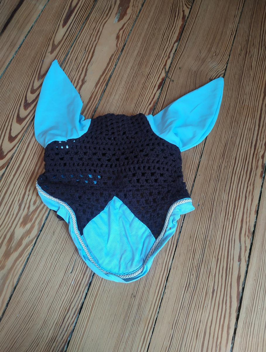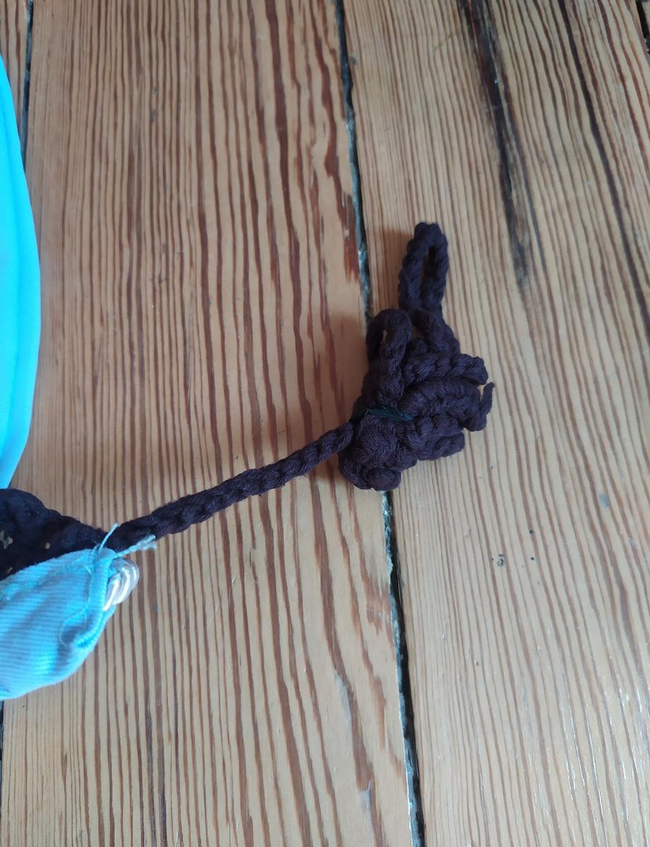 Bonnet marron et bleu avec ficelle pour l’attacher