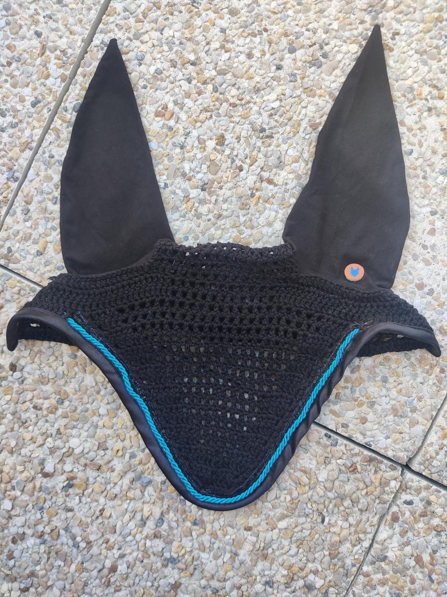 Je vends mon bonnet de la marque Equidées. Il est noir avec un contour velours noir, une cordelette bleu canard et un liseré pailleté noir. Bonnet court taille cheval. Il est en très bon état.
