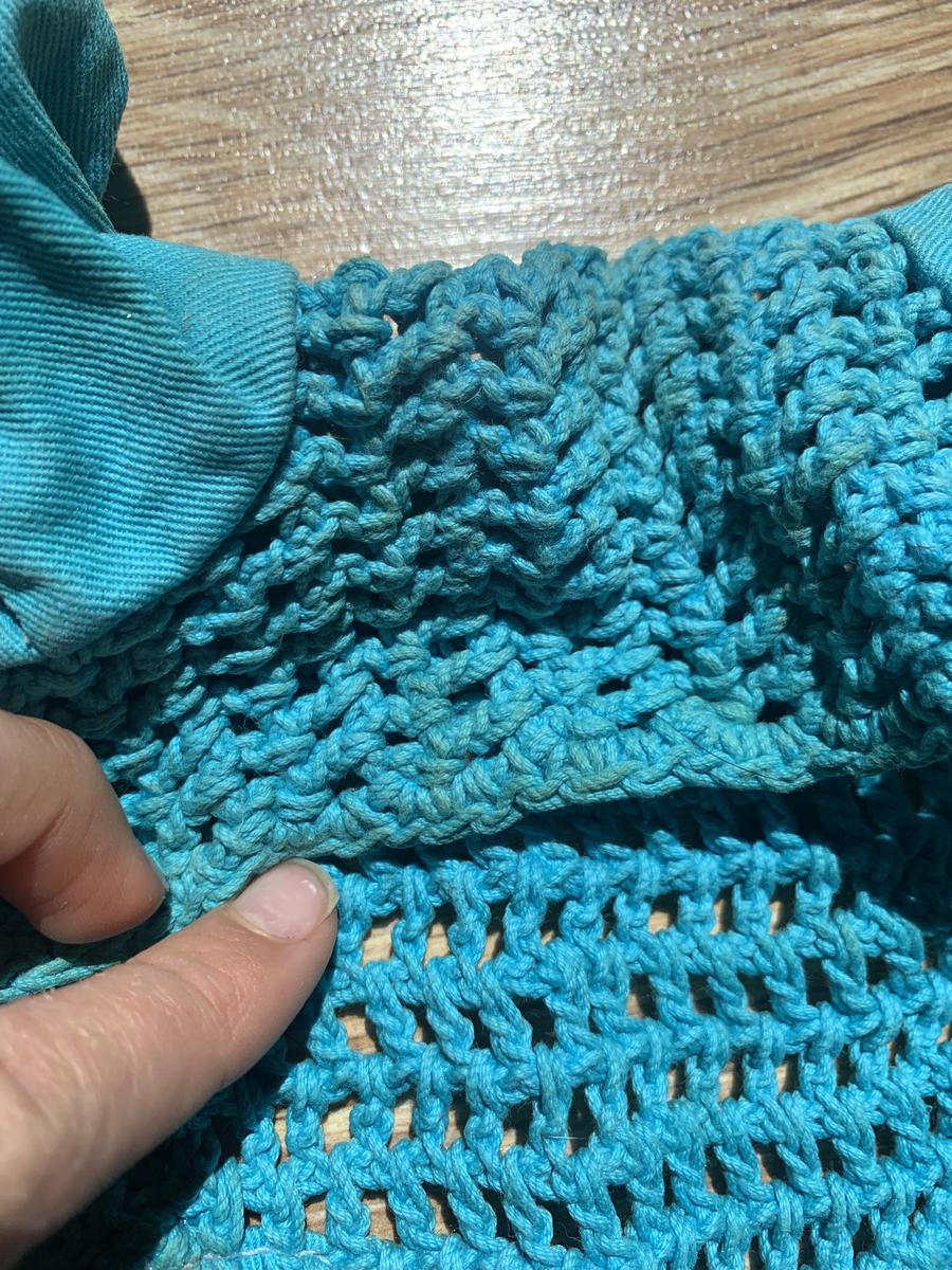 bonnet bleu cyan de la marque Lamicell, état moyen a des taches qui ne sont pas parties à la machine et un trou (qui peut être recousu), taille cob