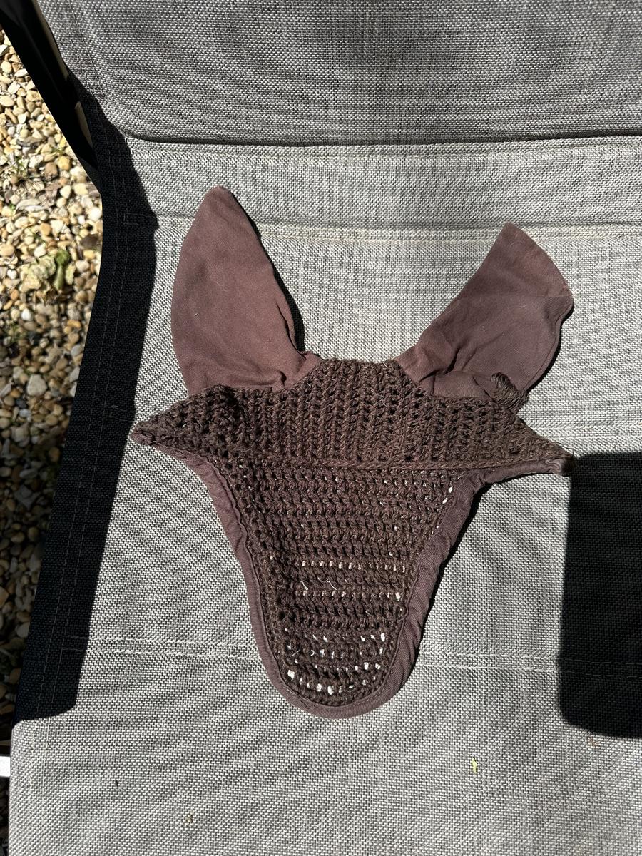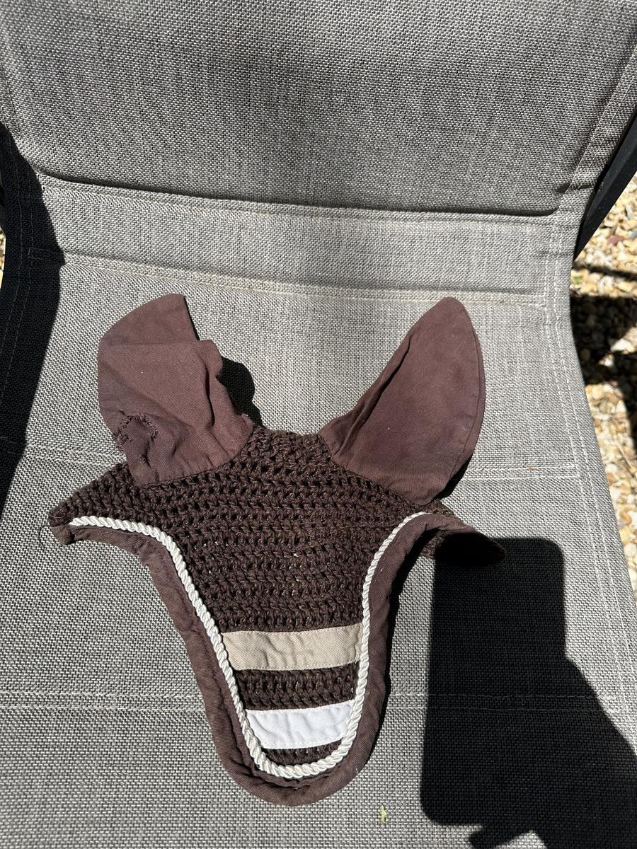 Bonnet marron et beige avec un trou recousu à l’oreille.