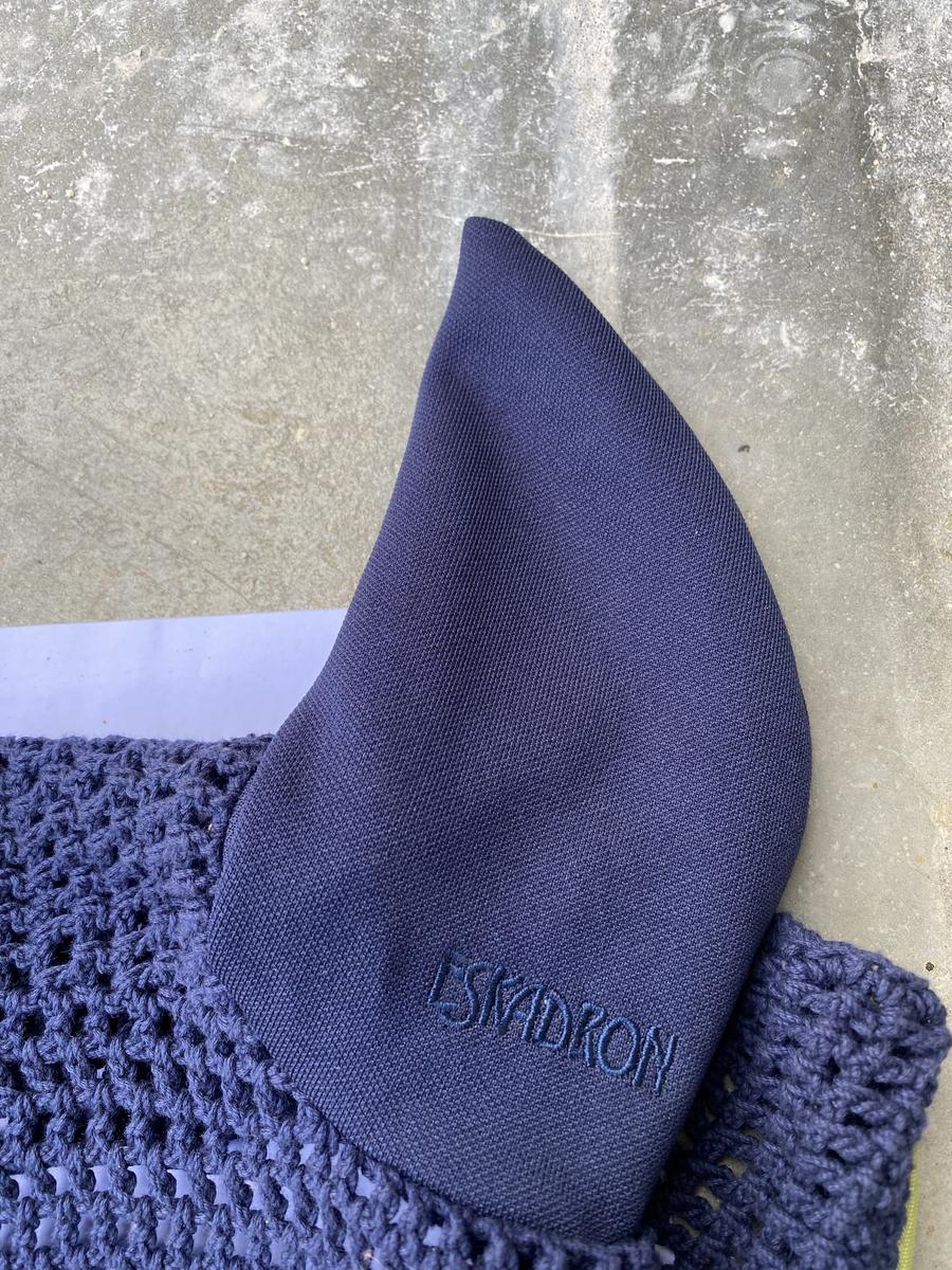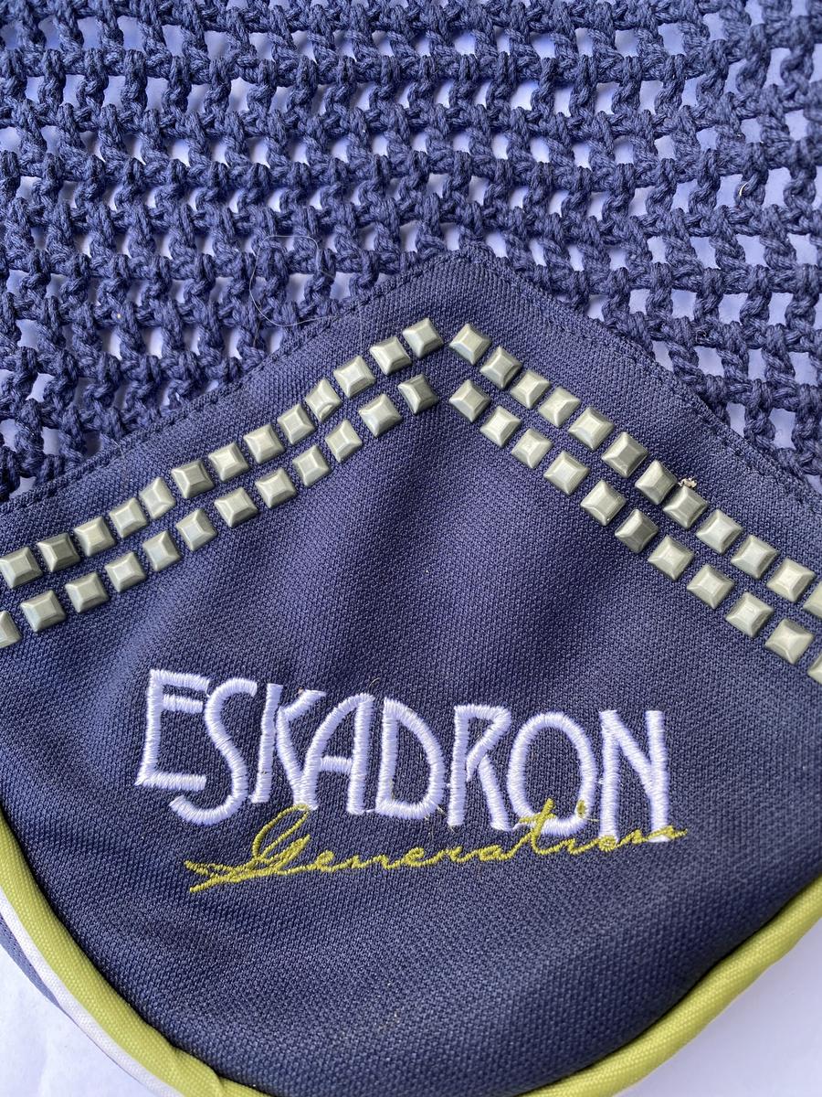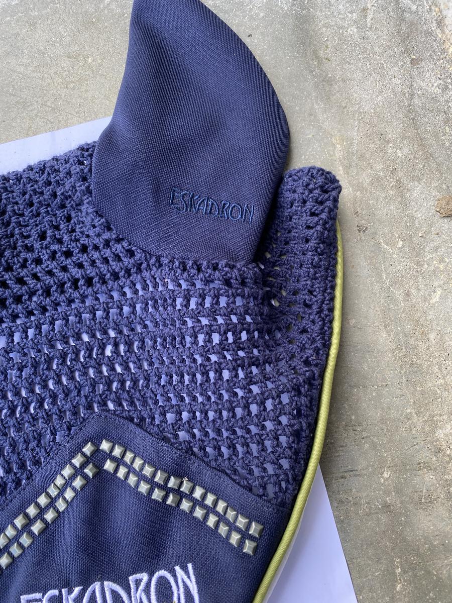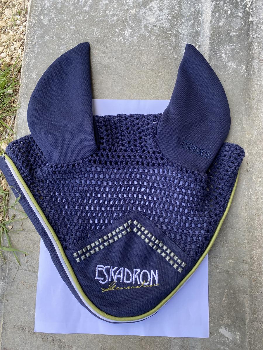Bonnet court Eskadron bleu marine avec détails vert. Taille cheval car ne convient pas à mon poney D. Jamais porté. En excellent état. Vente urgente.