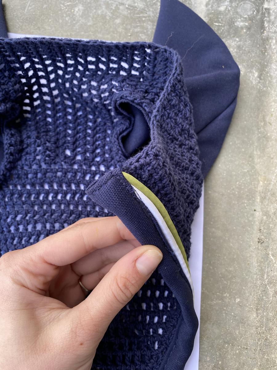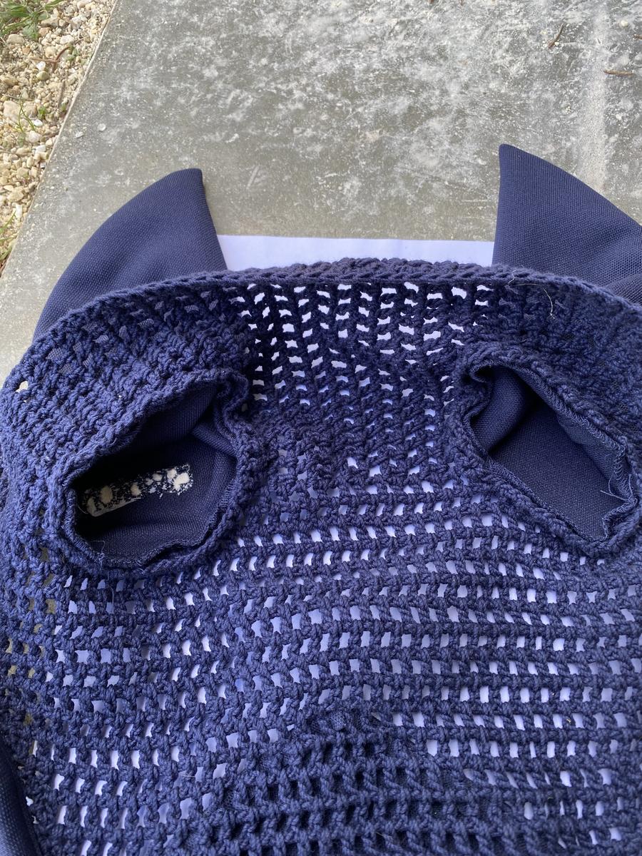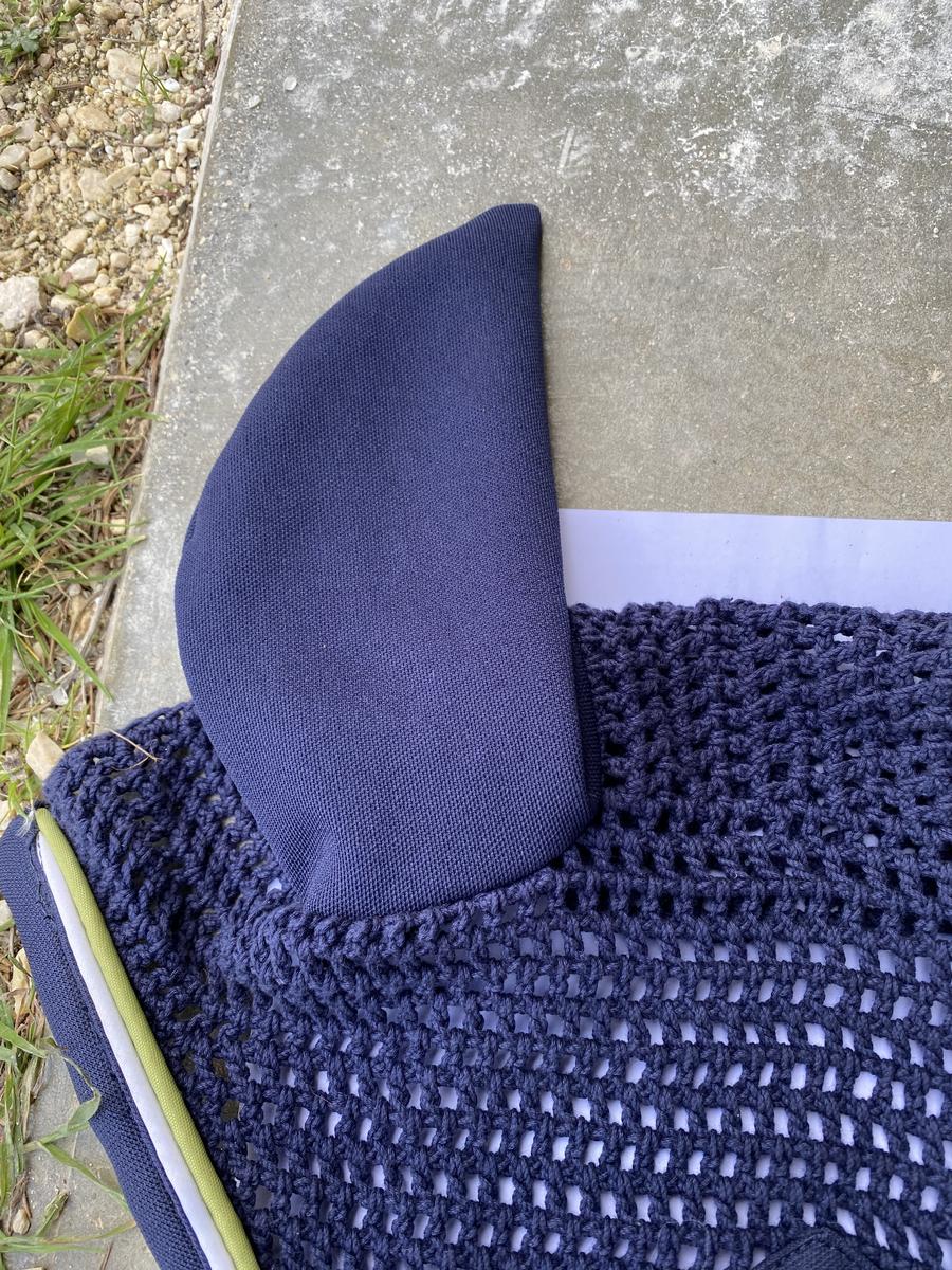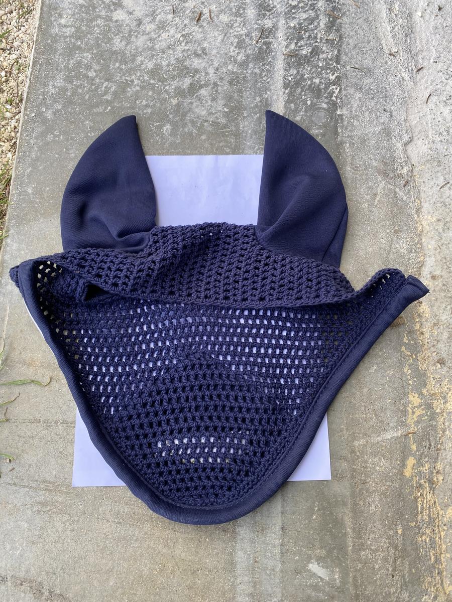 Bonnet court Eskadron bleu marine avec détails vert. Taille cheval car ne convient pas à mon poney D. Jamais porté. En excellent état. Vente urgente.