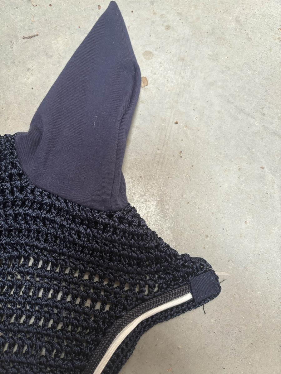 Bonnet pour cheval bleu marine avec liseré marine et blanc, avec logo de la marque Oscar & Gabrielle