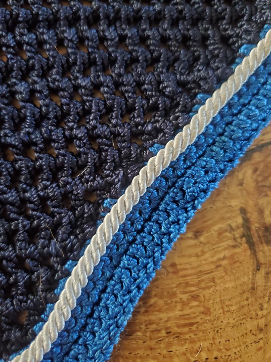 Il est bleu foncé avec le tour bleu clair et une cordelette beige.