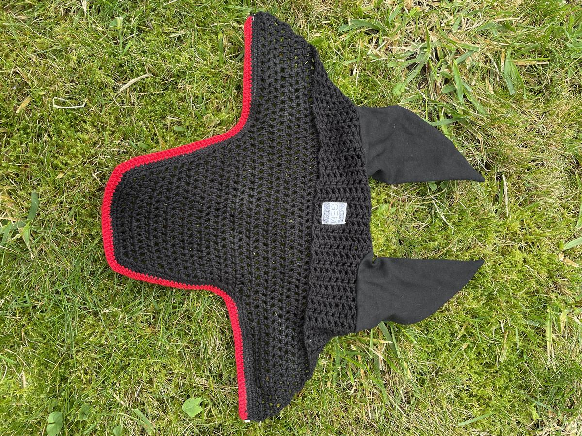 Bonnet court de la marque GEM Équitation, modèle Spinelle. Base noire avec le bord rouge et un liseré blanc.