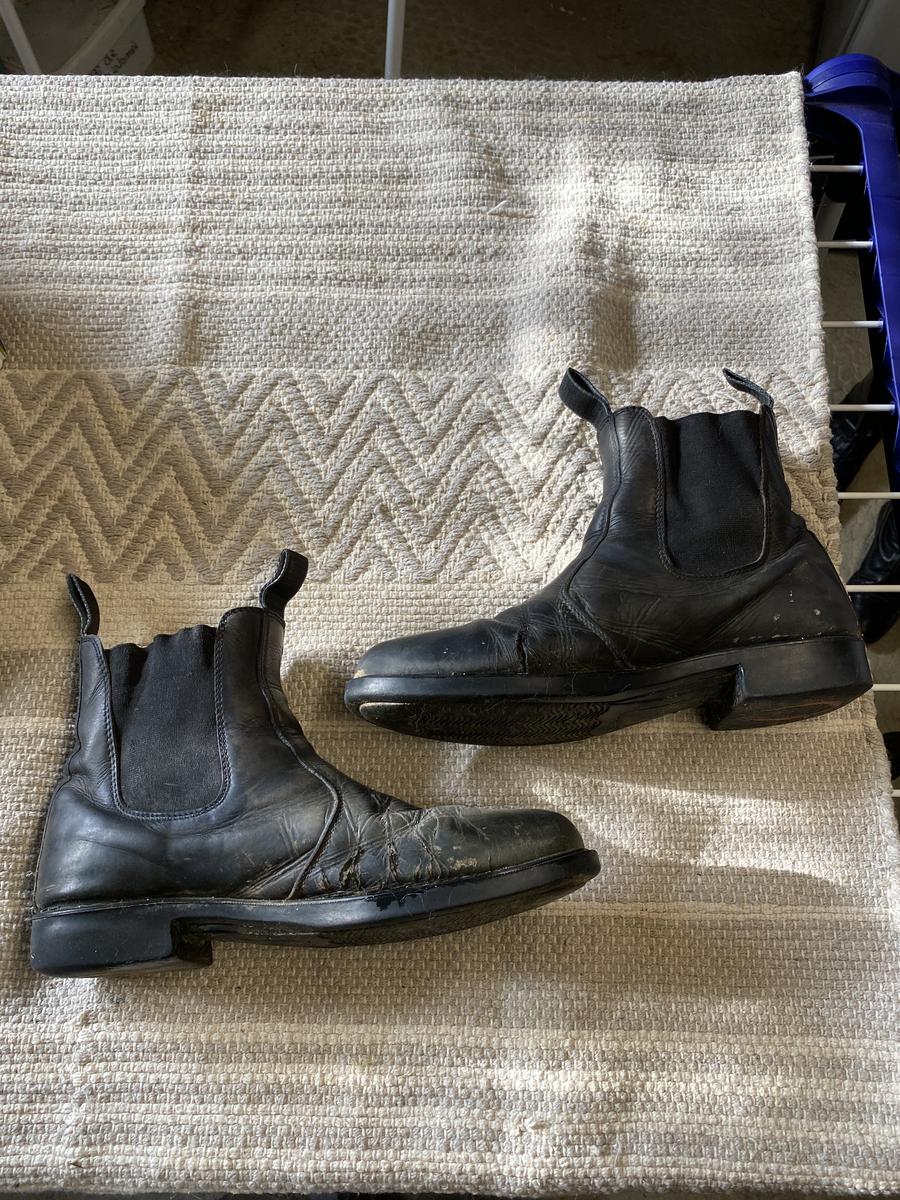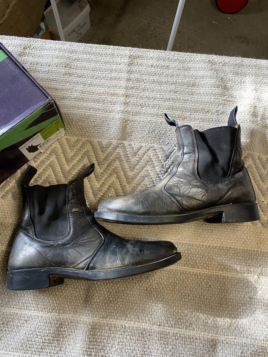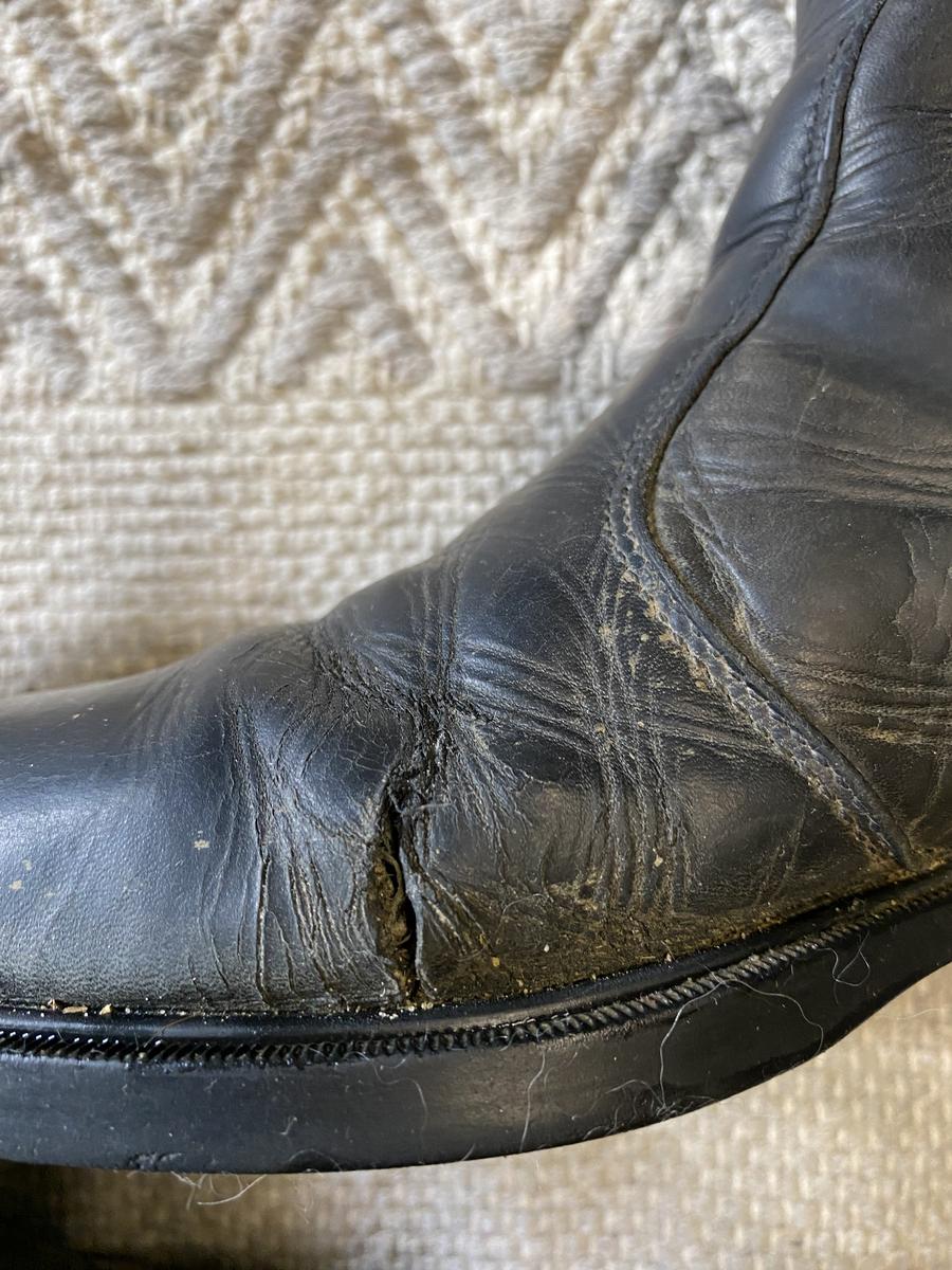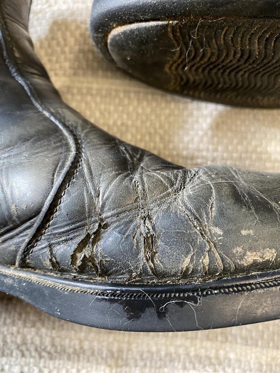 Défaut esthétique mais ne gêne pas à cheval, le cuir a l’avant et à l’intérieur du pied est craquelé sur une petite zone, une boots présente une fissure dans le cuir et l’autre a des éraflures.