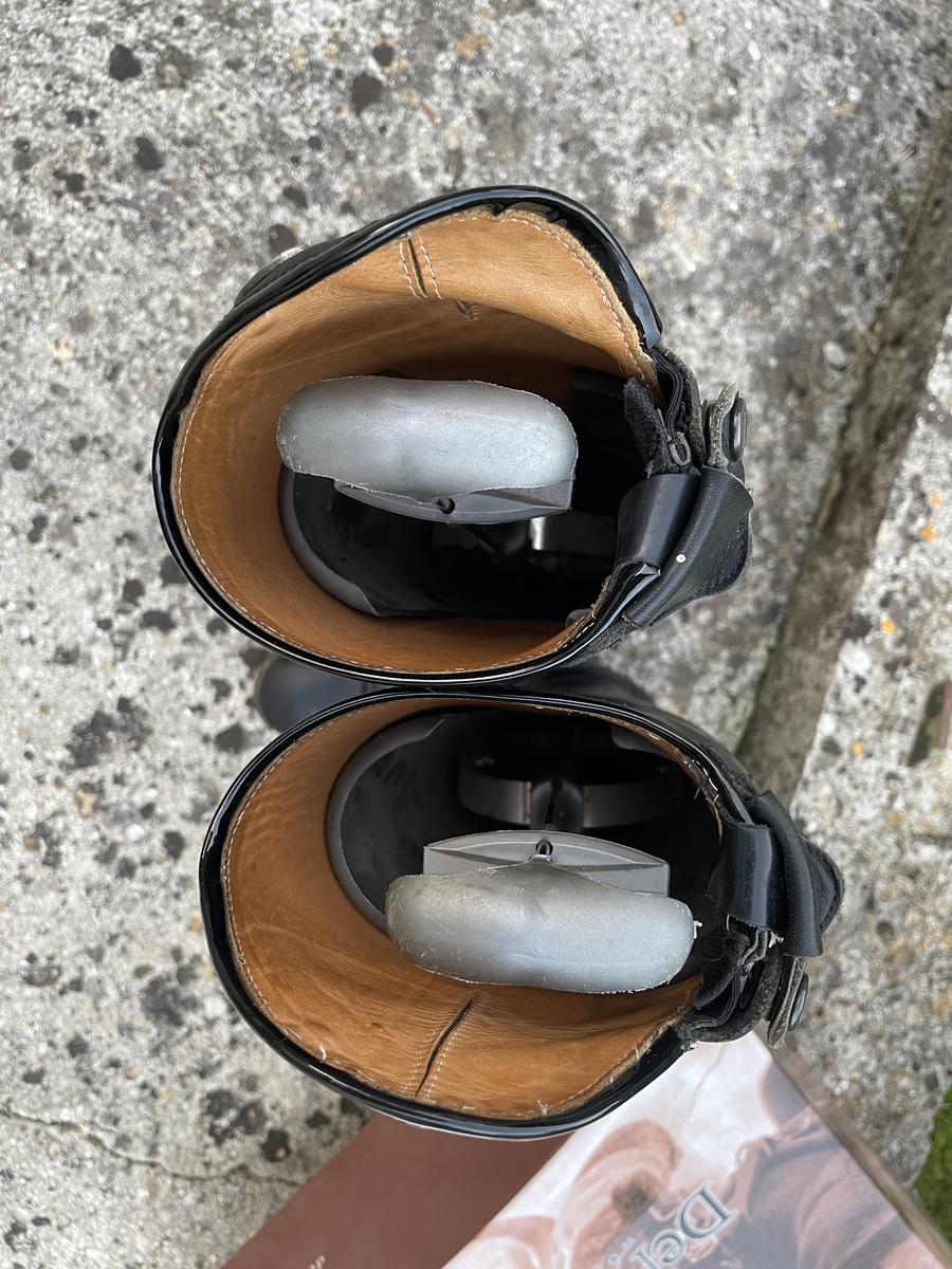 Noires avec liseré vernis du le haut de la botte, sur le coup de pied et sur le bout