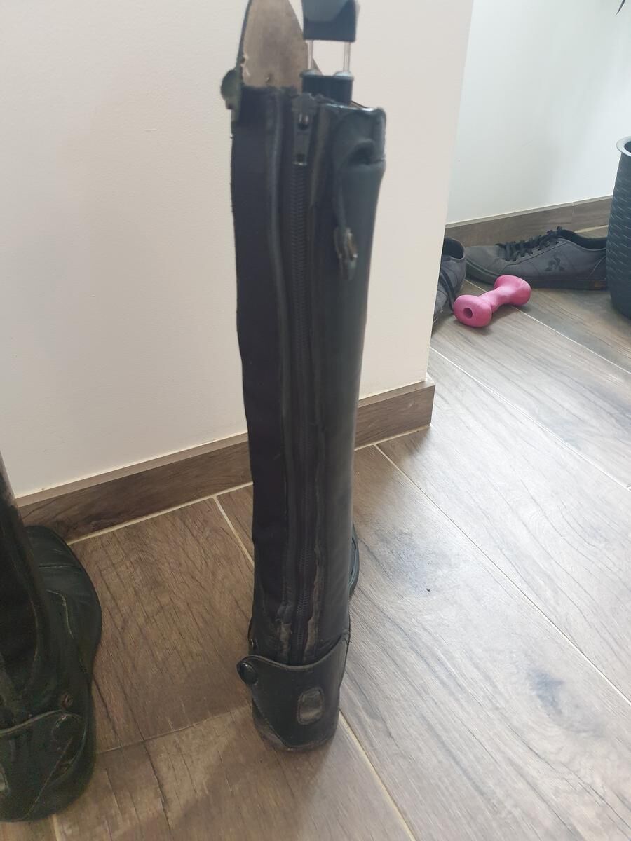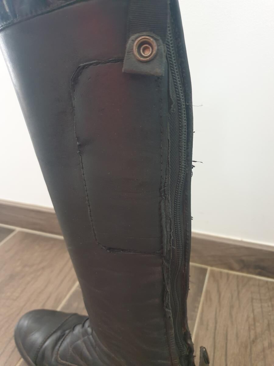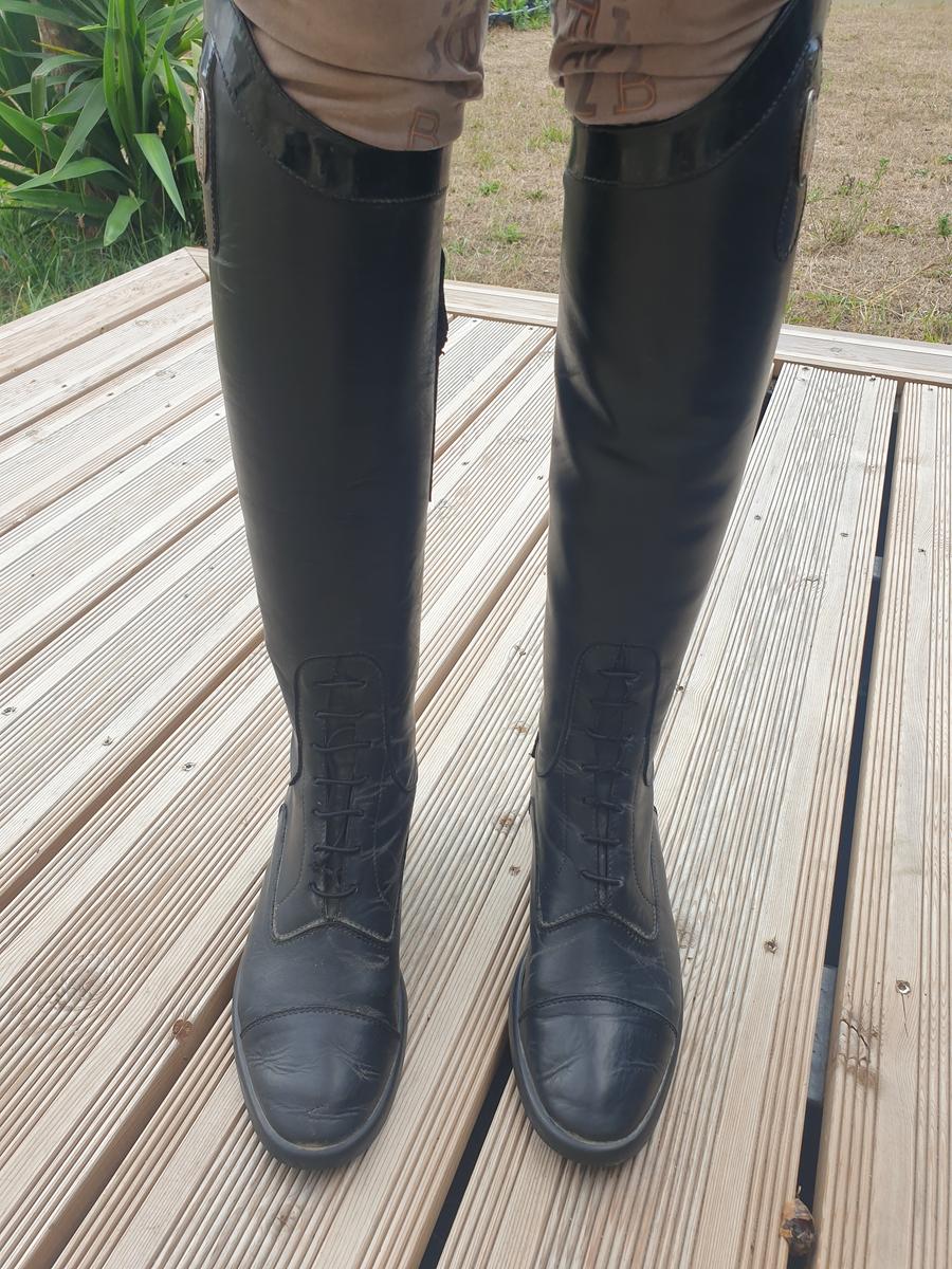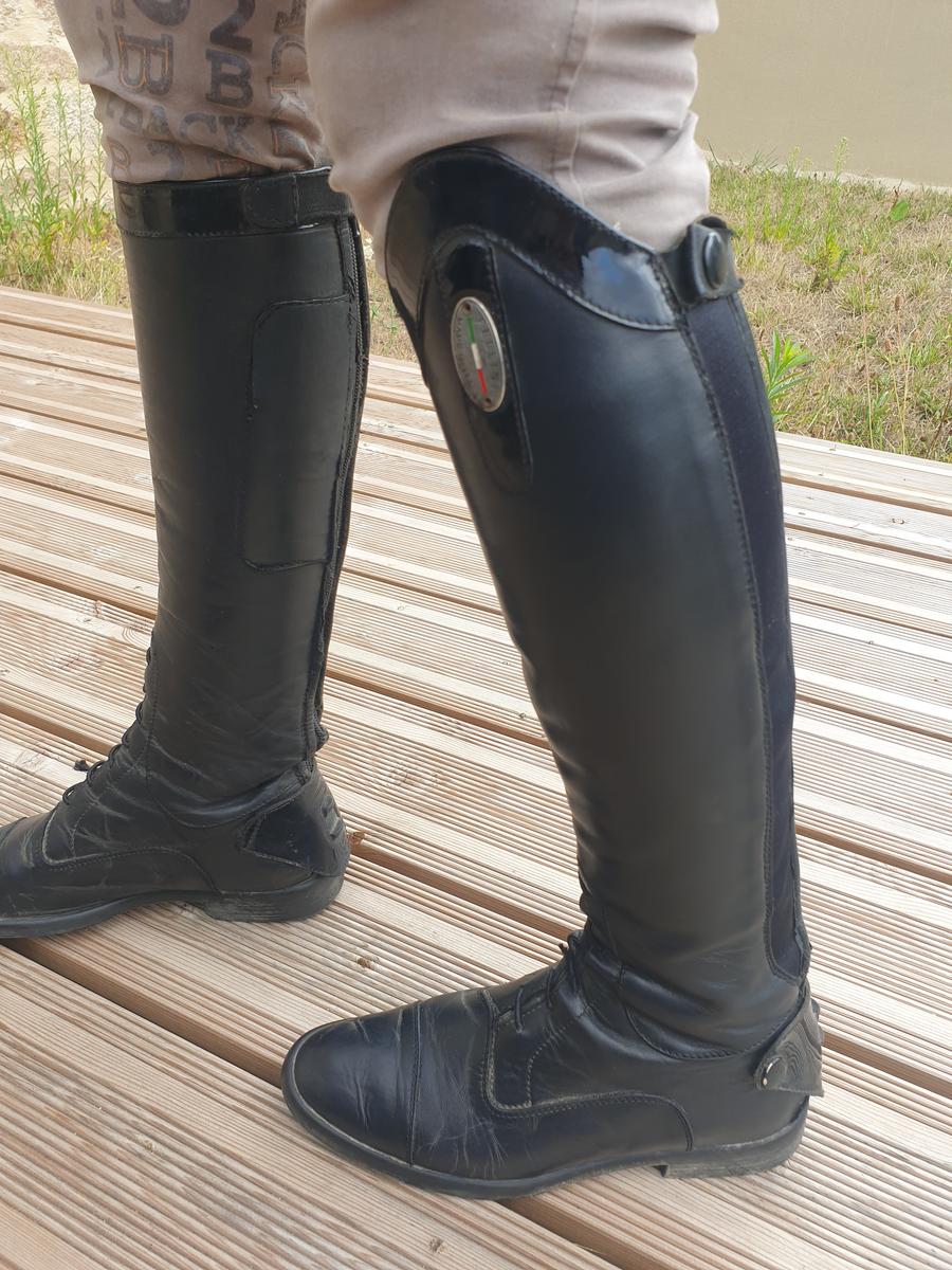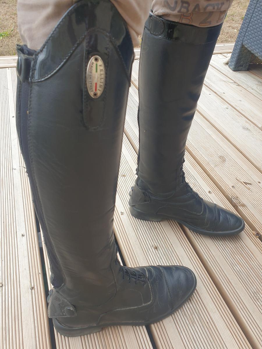 Je vends cette paire de bottes d'équitation de la marque Fellini. Cuir noir et détails brillant/vernis. Cuir très souple. Elles ont bien servies mais toujours en bon état. Les fermetures fonctionnent très bien. Les élastiques du devant tiennent encore mais ne sont pas nickel. Réparation intérieur du mollet faite par cordonnier