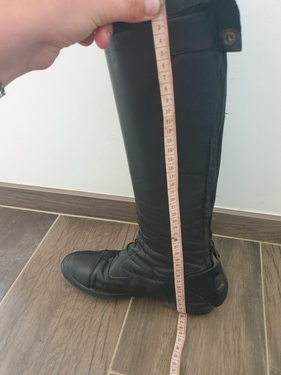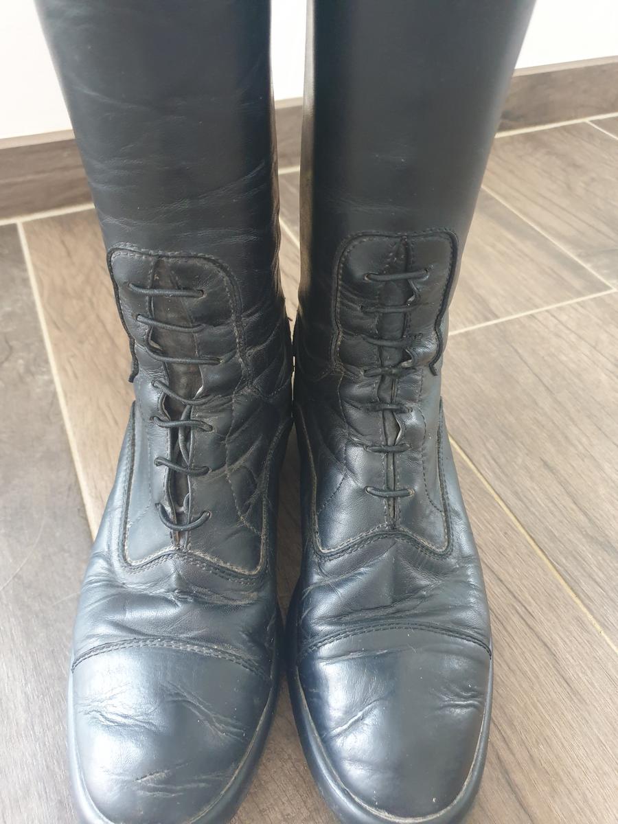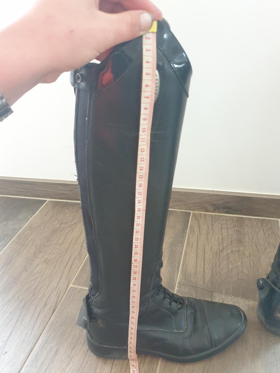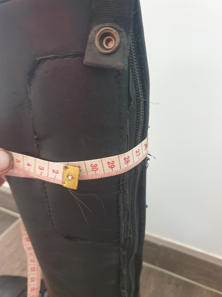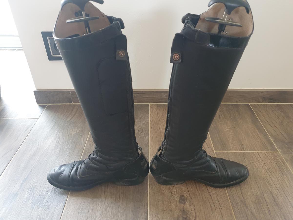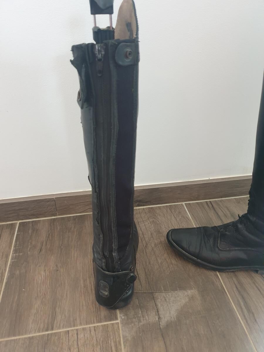 Je vends cette paire de bottes d'équitation de la marque Fellini. Cuir noir et détails brillant/vernis. Cuir très souple. Elles ont bien servies mais toujours en bon état. Les fermetures fonctionnent très bien. Les élastiques du devant tiennent encore mais ne sont pas nickel. Réparation intérieur du mollet faite par cordonnier