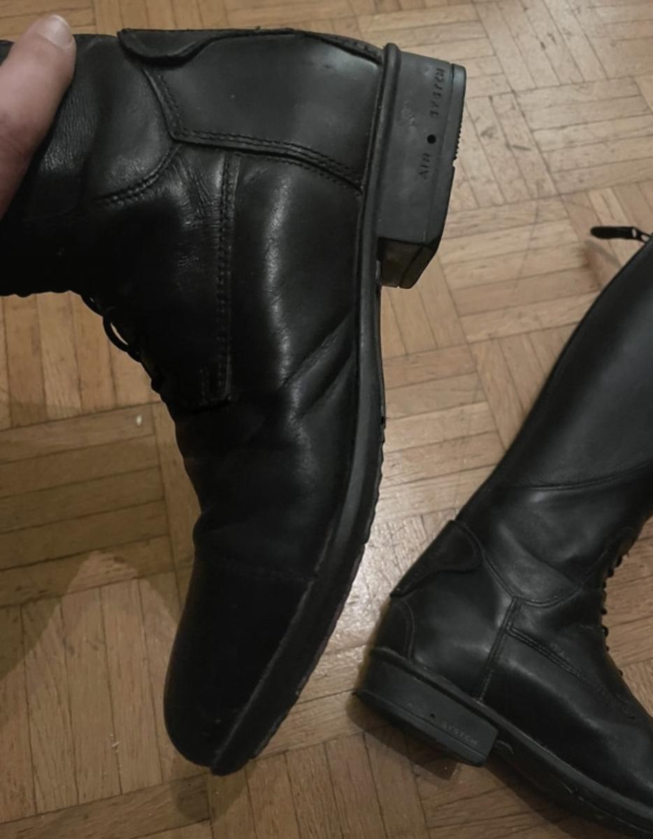 Très belle affaire, quasiment neuves, puisque portées deux à trois fois par semaine pour une durée d’une heure par séance, Ma fille n’a jamais marché avec puisqu’elles étaient mises avant la monte et ôtées dès la descente. Elles n’ont été utilisées que pendant une durée de deux mois, puisque ma fille a été victime d’un accident incombant quatre mois d’arrêt. À sa reprise, les bottes étaient trop petites.