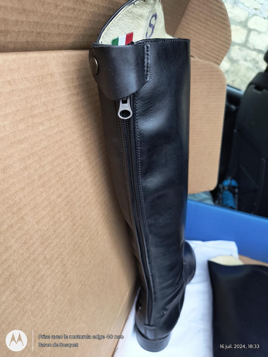 Bottes en cuir italien, portées seulement 1 fois car trop serrées pour moi. Taille de mollet S, soit environ 36 cm.