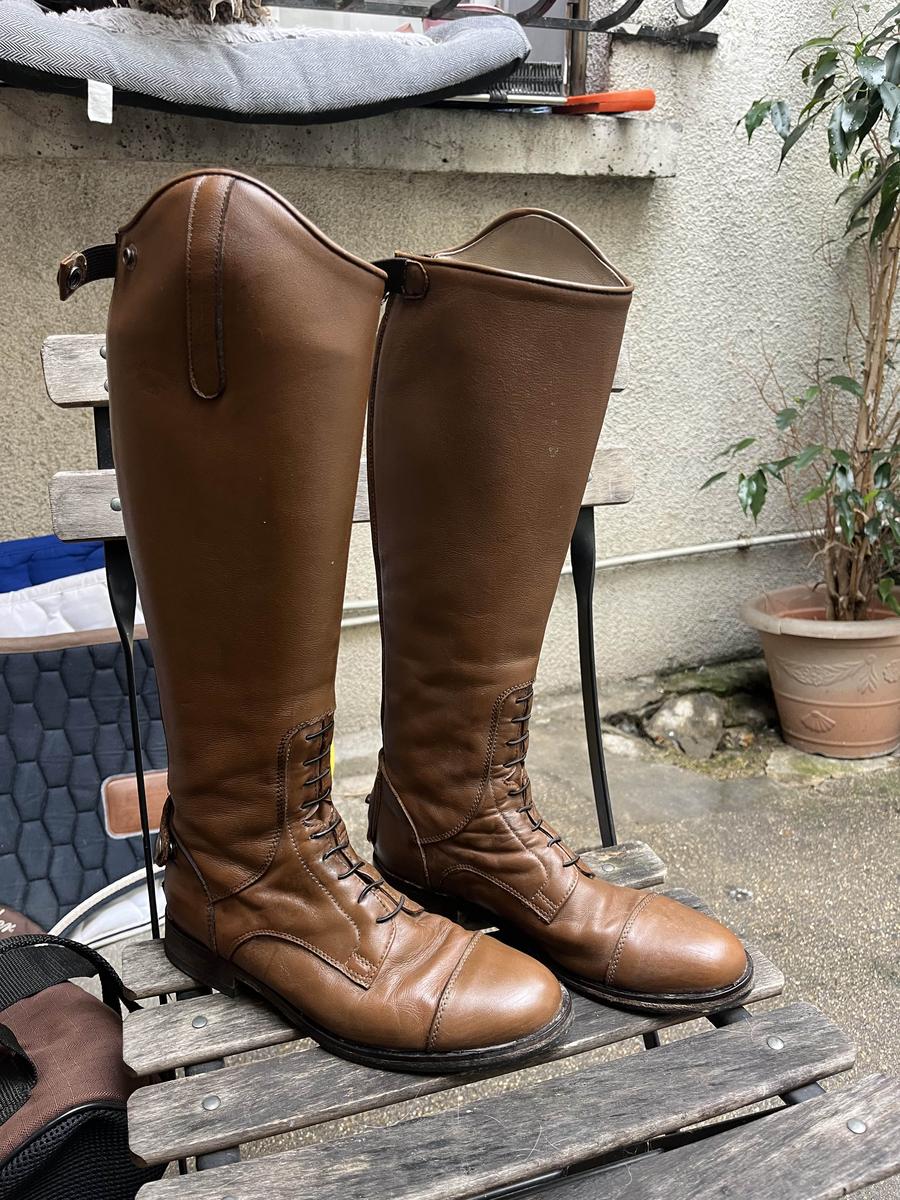 bottes casi neuves avec sa housse imperméable ! acheté a lamotte. hauteur de tige indéfini (je fais 1m65 et me vont parfaitement)