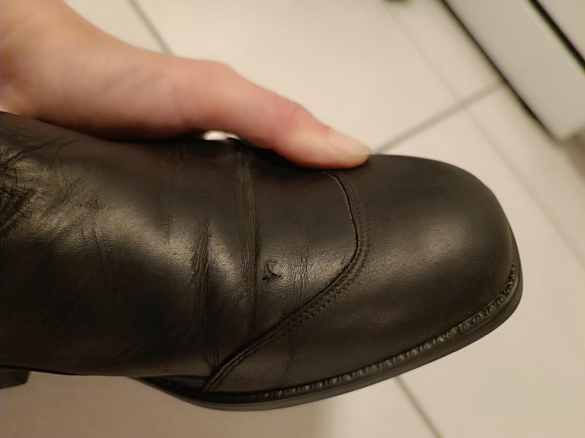 Portées quelques fois, comme neuve, seulement un tout petit accro reporté sur les photos (seule la couche de cuir supérieure est abîmée, ce n'est pas un trou qui traverse).