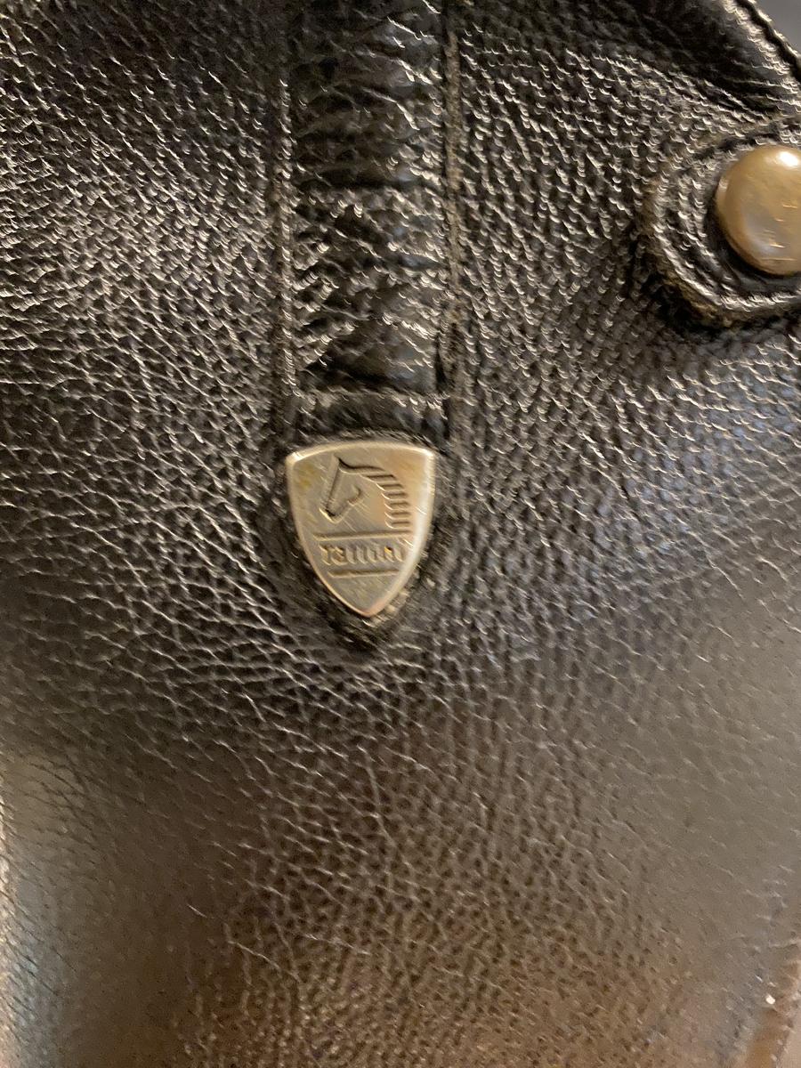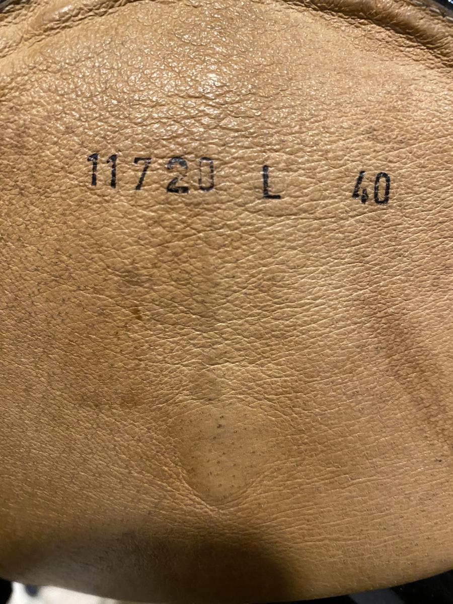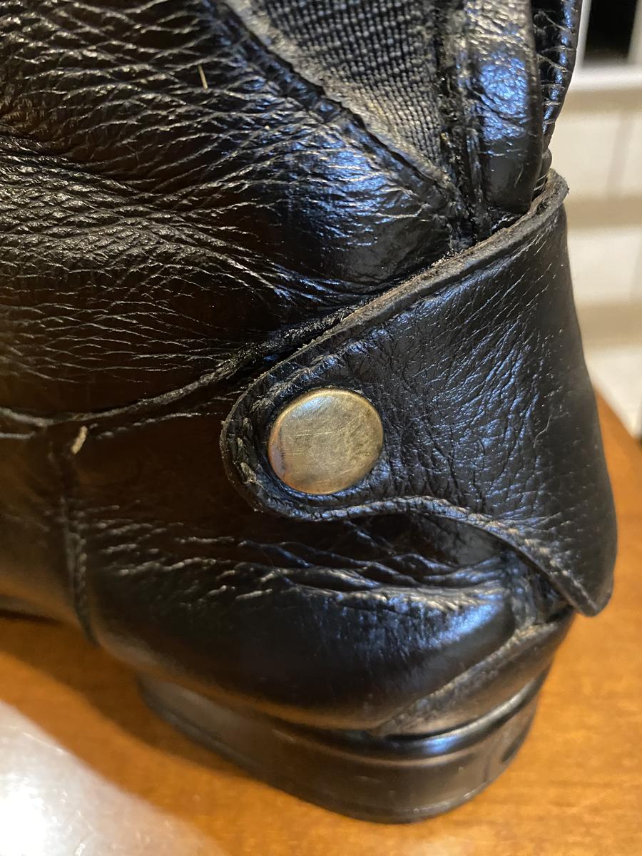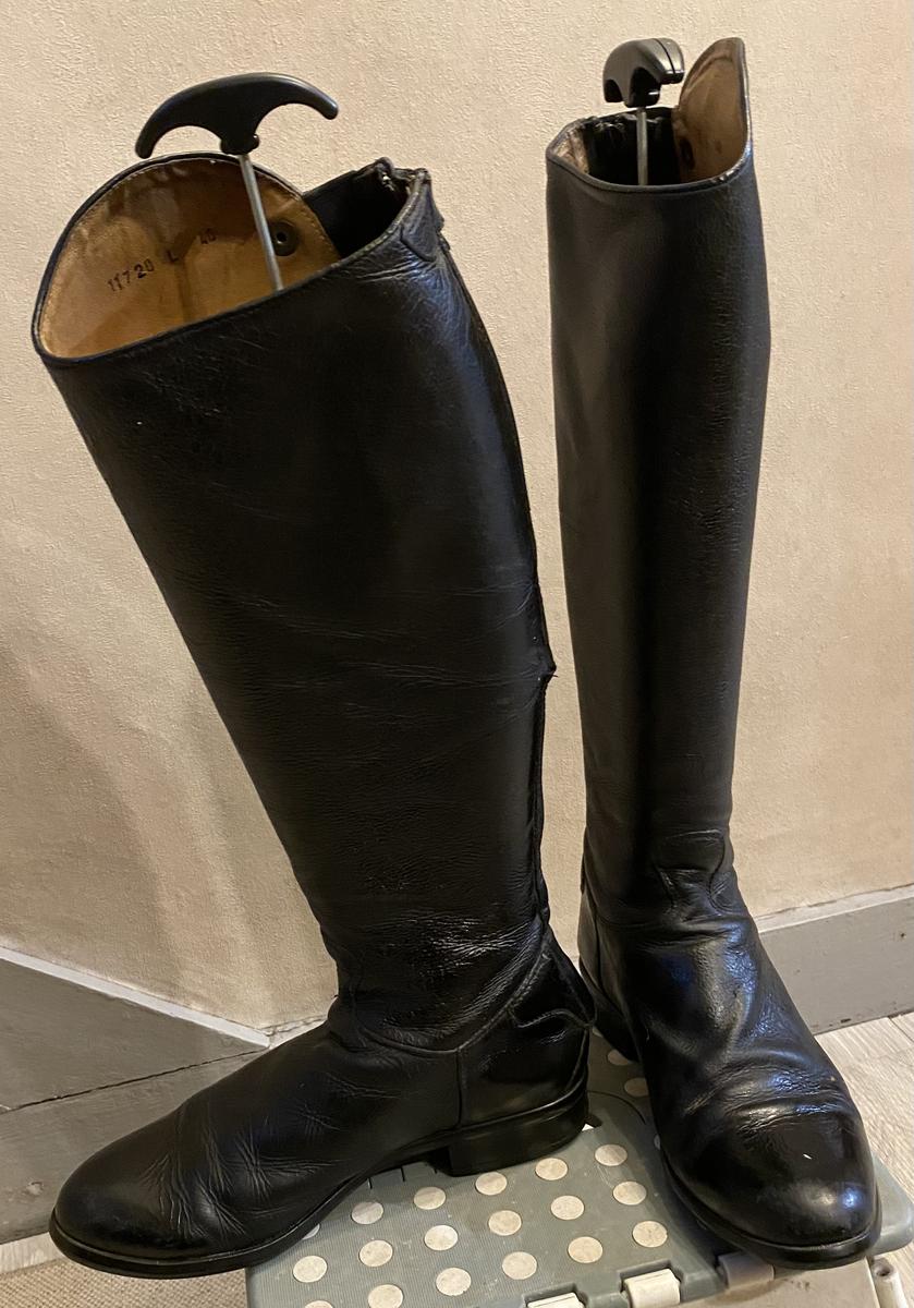 Bottes noires en cuir grainé lisse et souple, sans lacet, mollet L, fermeture par fermeture éclair et pressions en haut et en bas. Bon état avec quelques marques d'usure à l'arrière du mollet.