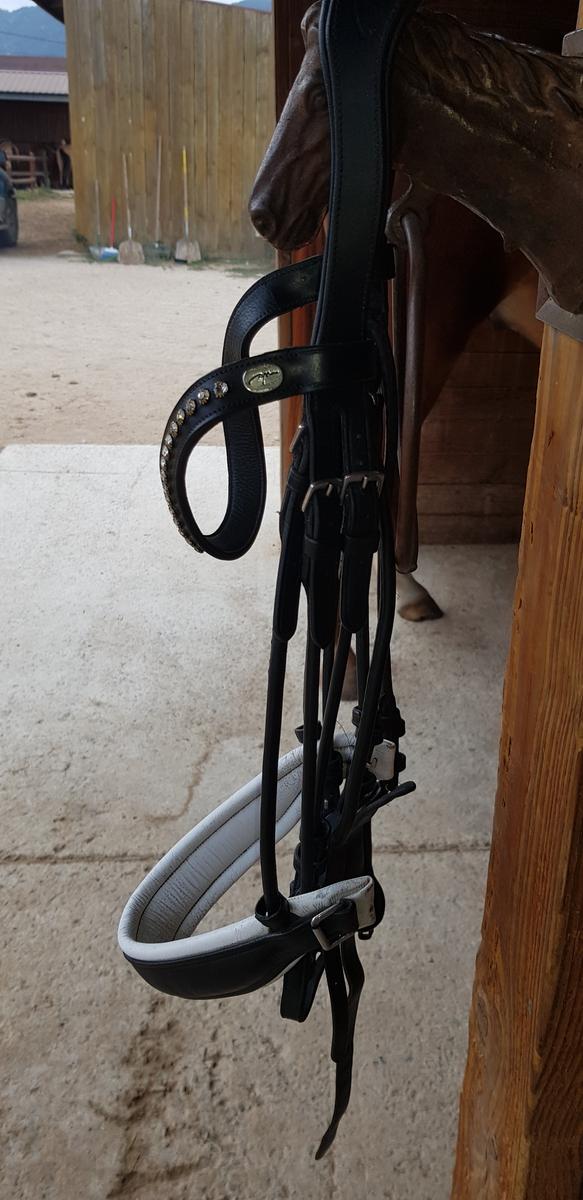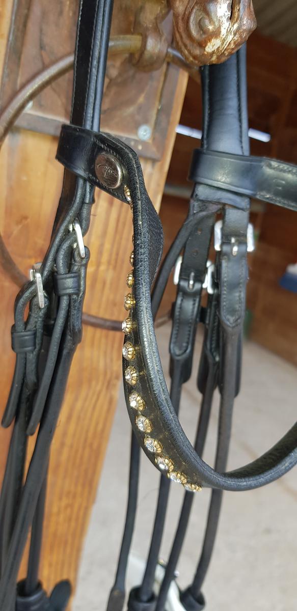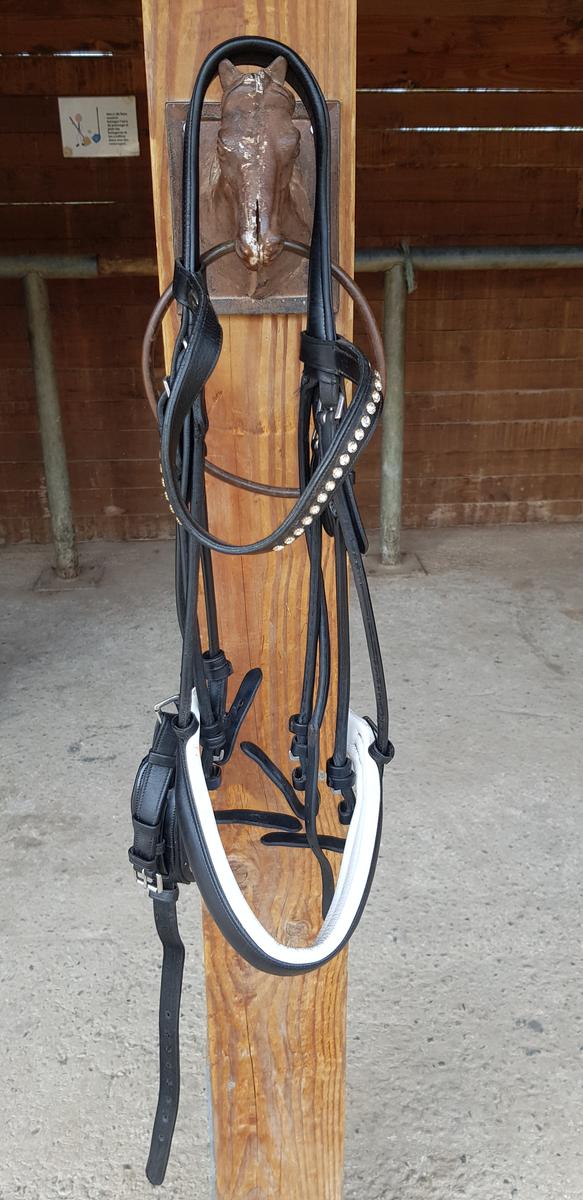 Bride DY'ON cuir rond avec frontal Swarovski. Muserolle large doublée blanc pull back. Taille cheval.