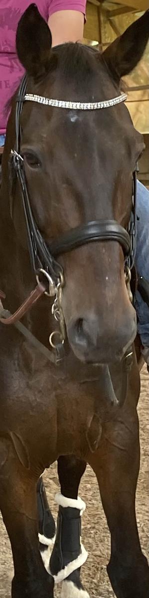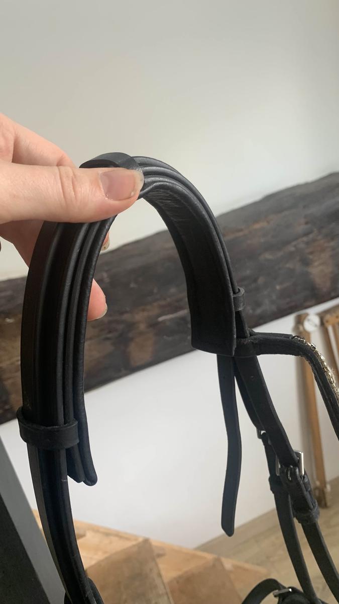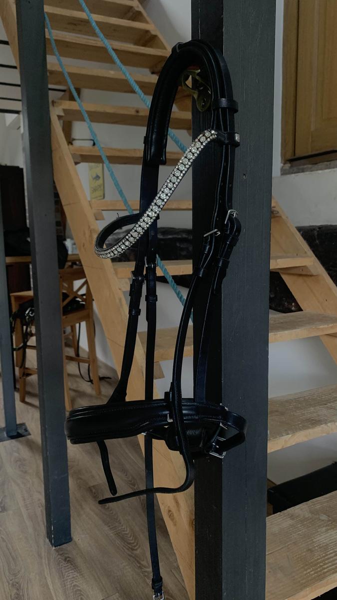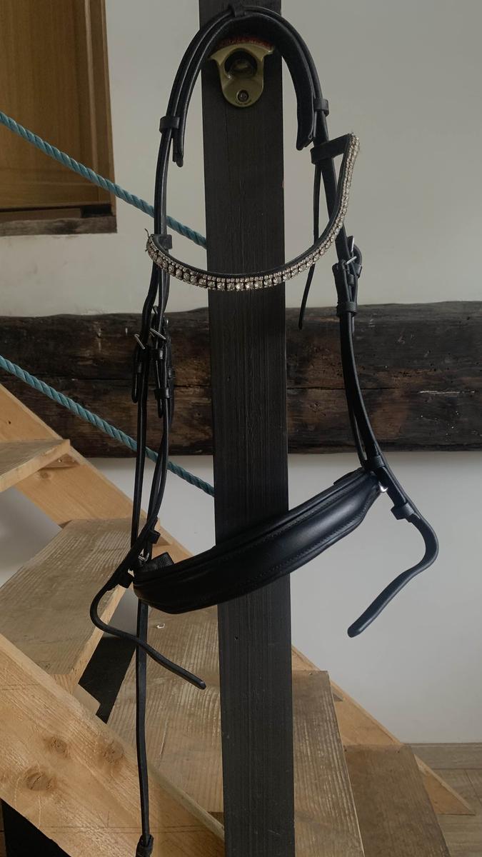 Bride noire ayant très peu servie (seul le montant de bride est actuellement utilisé en dépannage sur un autre filet en attendant ma nouvelle bride). Elle est en excellent état et peut également être utilisée en filet. Le cuir est souple et bien nourri, quelques strass sont manquants ✨ Sera vendue sans mors et sans rênes ⚠️ Négociable