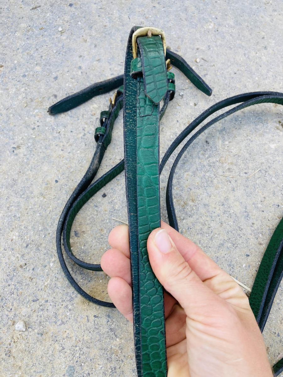 Taille petit cheval. Très bon état. Couleur verte, le cuir a un effet « crocodile ».