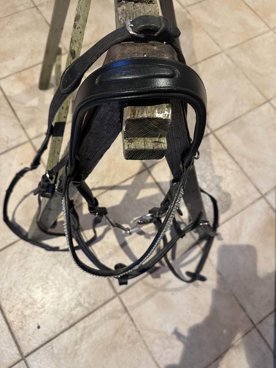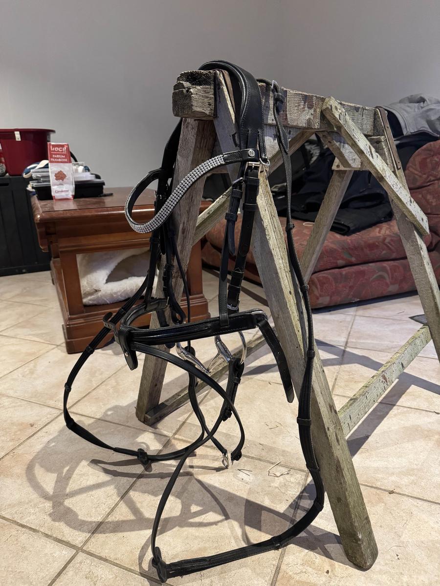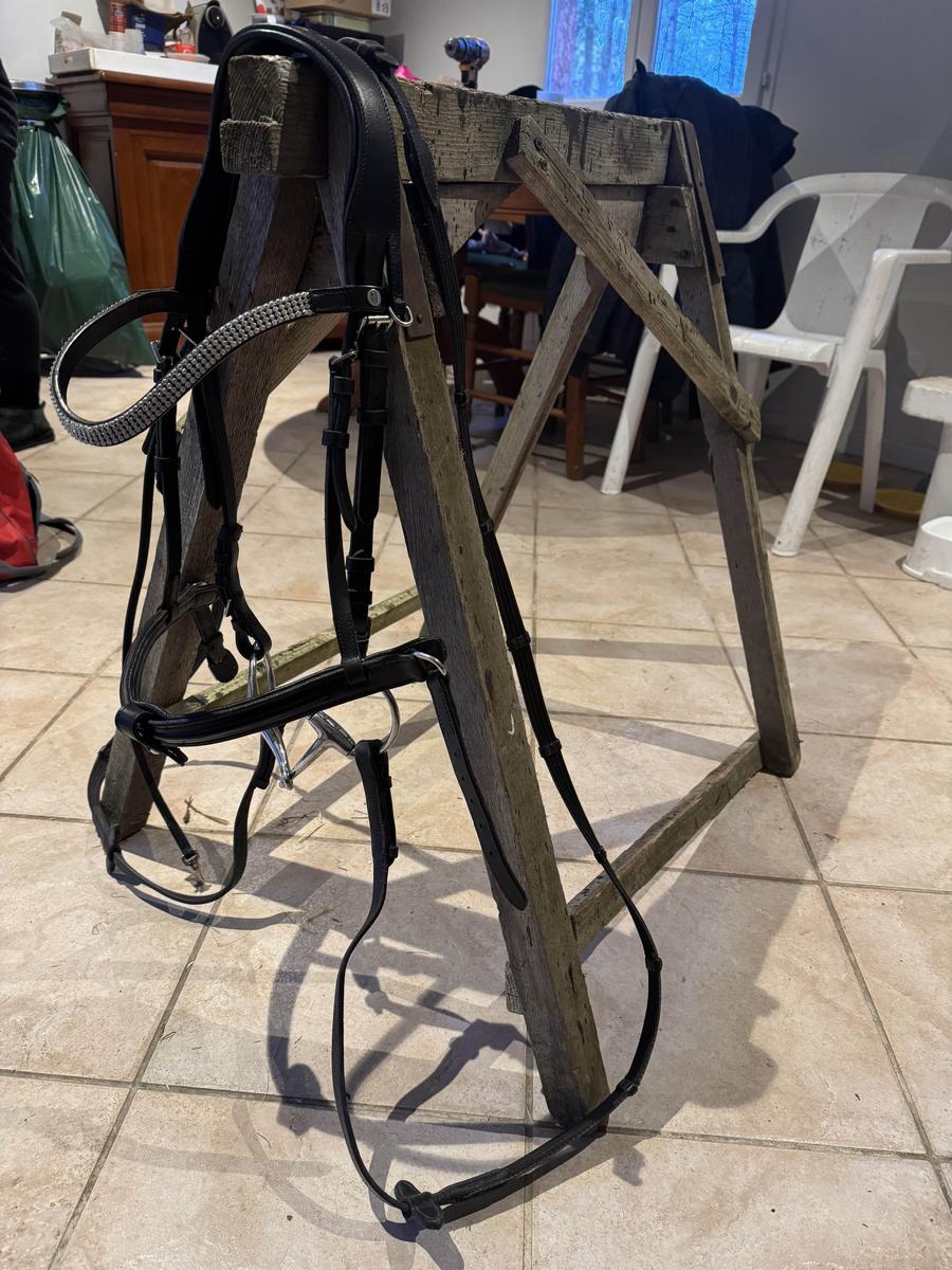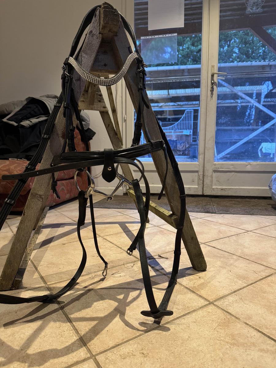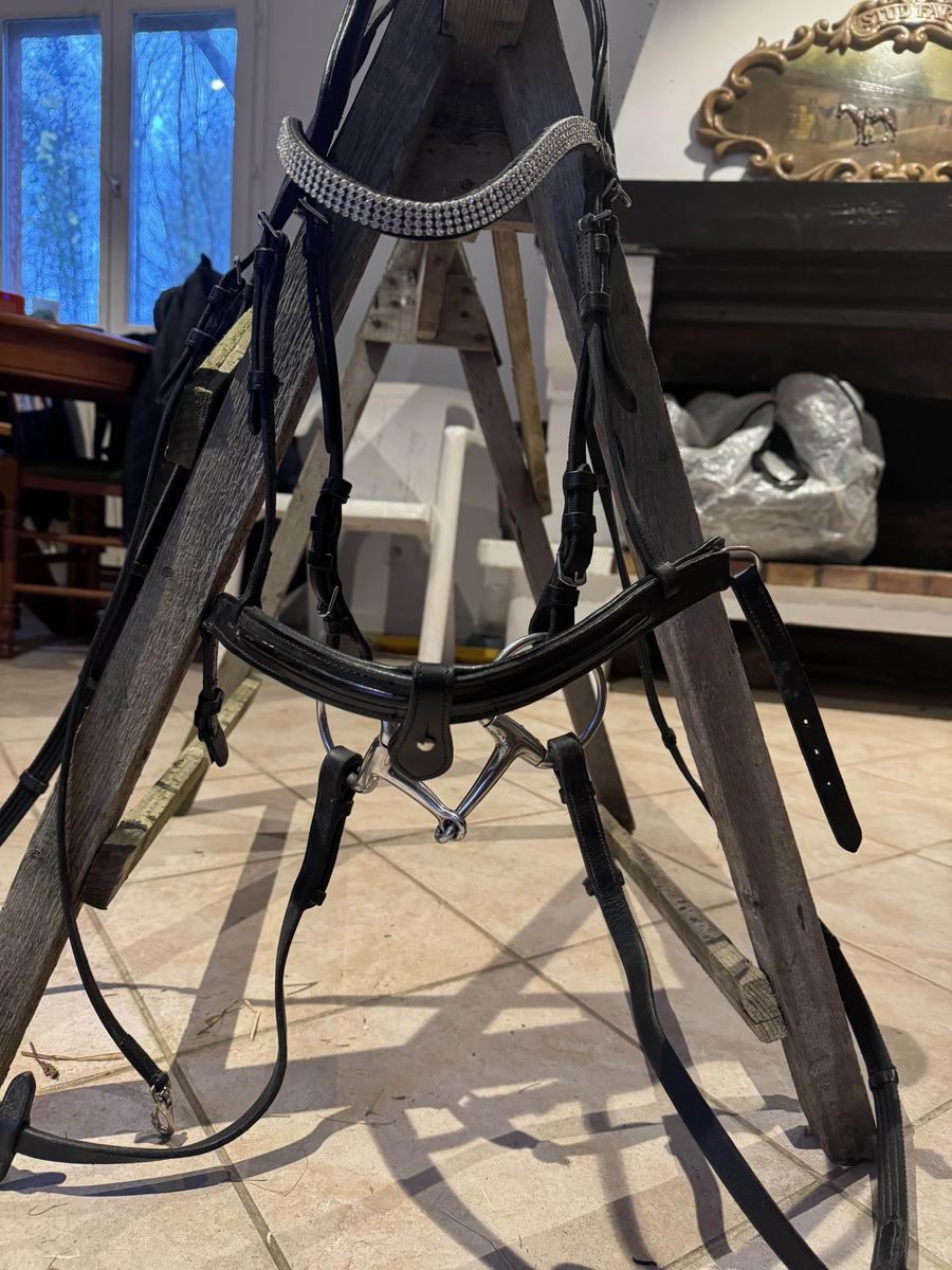 À vendre filet en cuir noir muserolle française glossy, frontal strass taille CS avec mors olive simple brisure en 125 et rênes.
