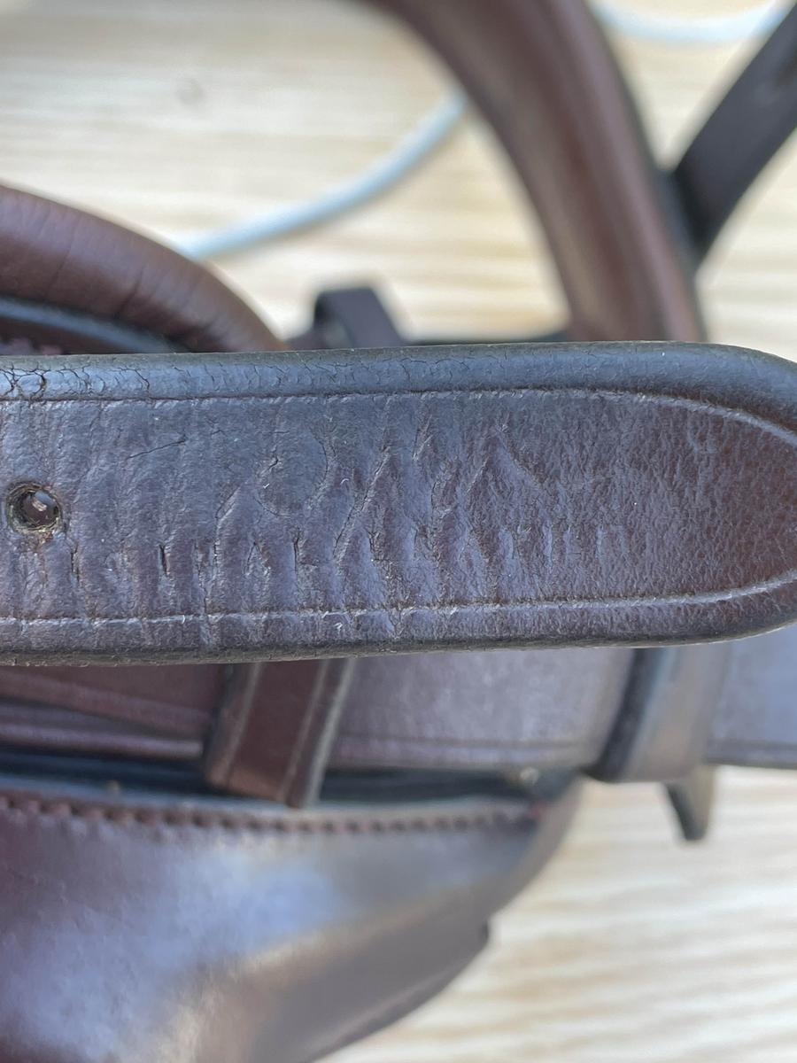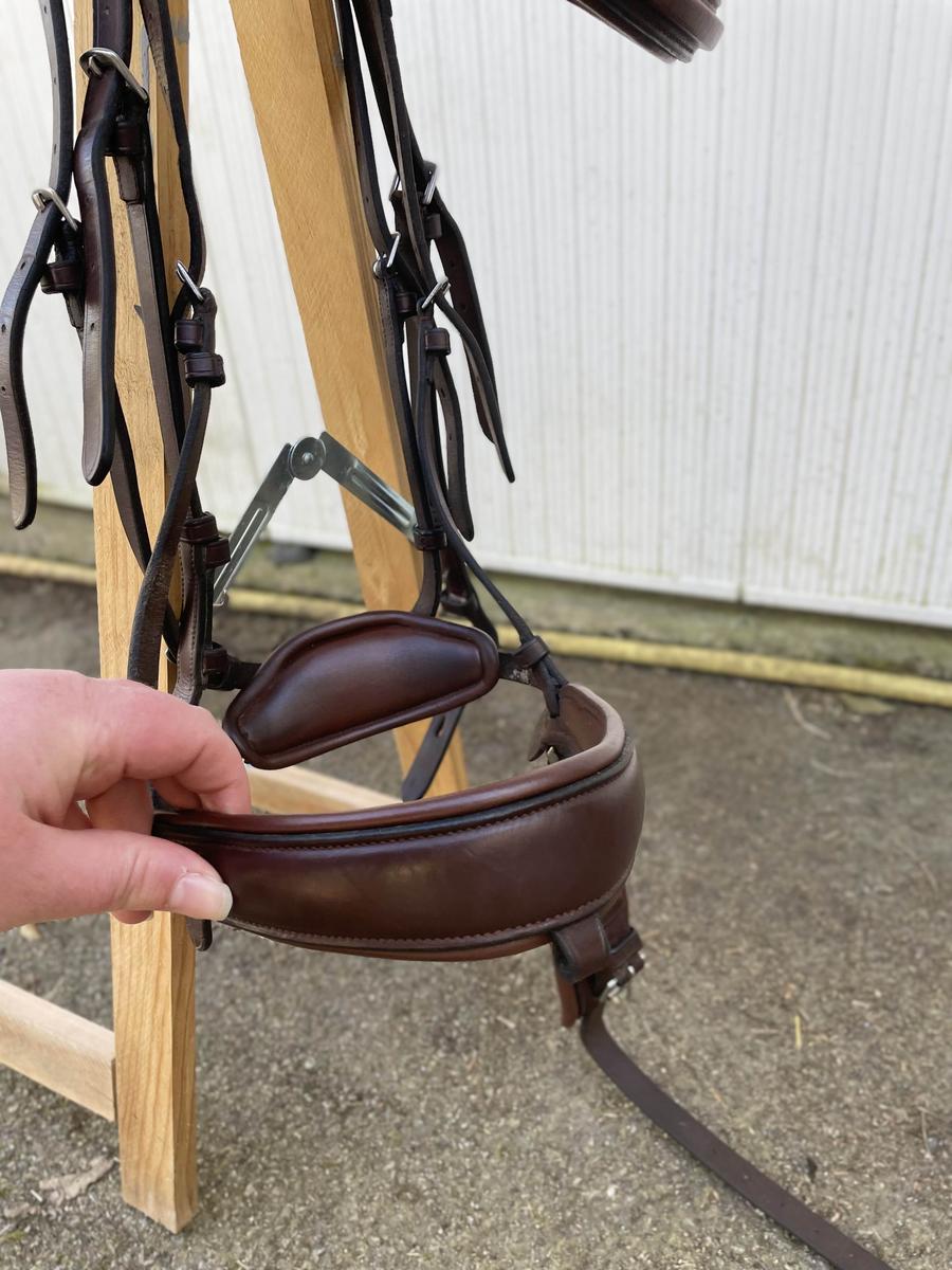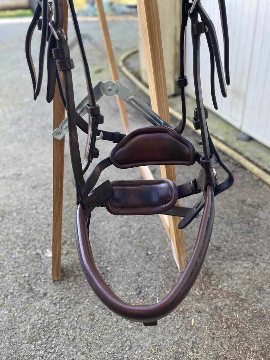 Filet Dy’on têtière déportée et muserolle large. Têtière et frontal en une pièce qui permet de dégager la 1ère et la 2ème cervicale • Système de sous gorge unique reliée à la muserolle afin de garantir le maintien de la têtière à l’arrière de la 2ème cervicale (cette sous gorge doit être fermement ajustée sur les joues) Prix neuf 350€