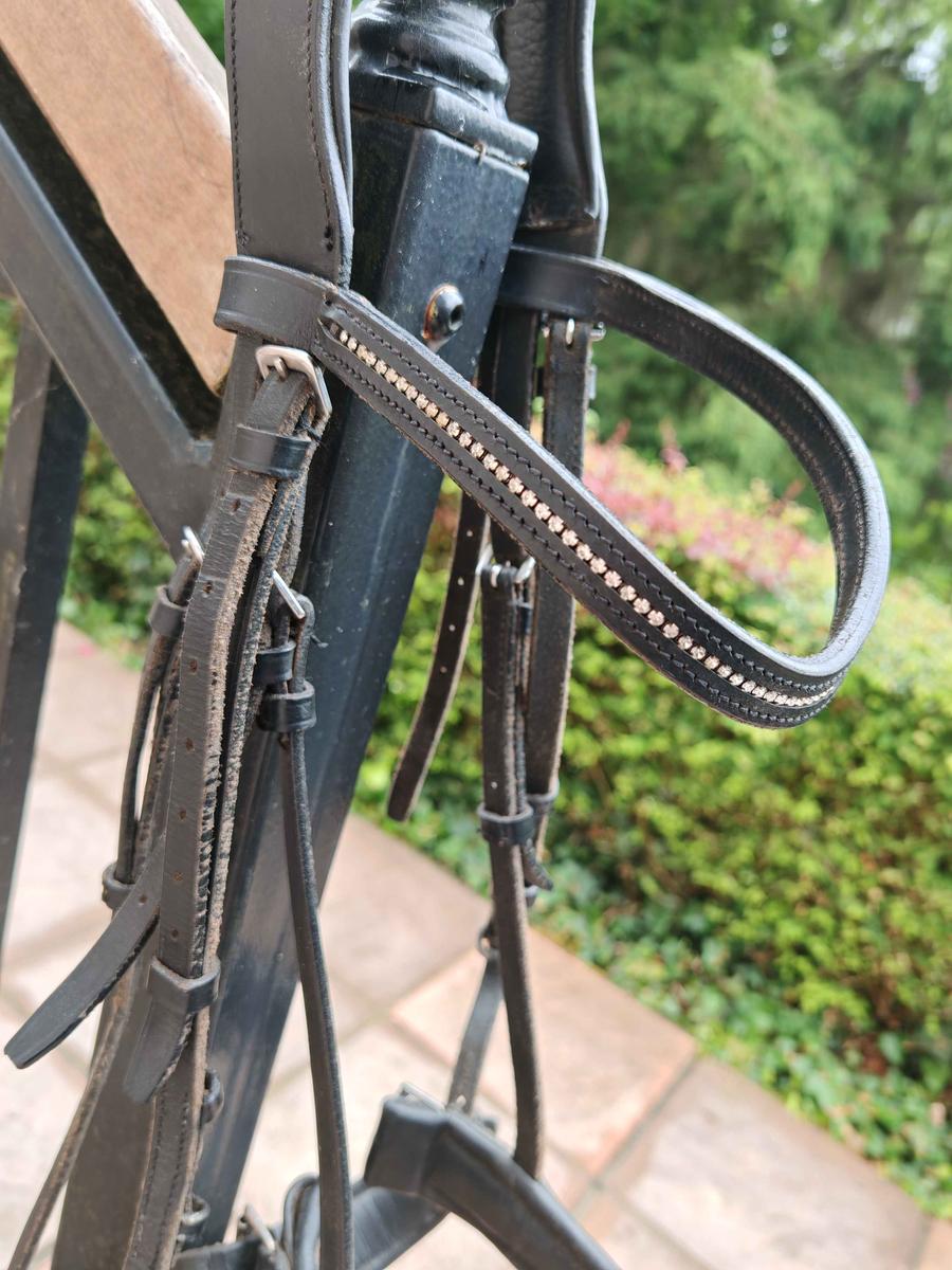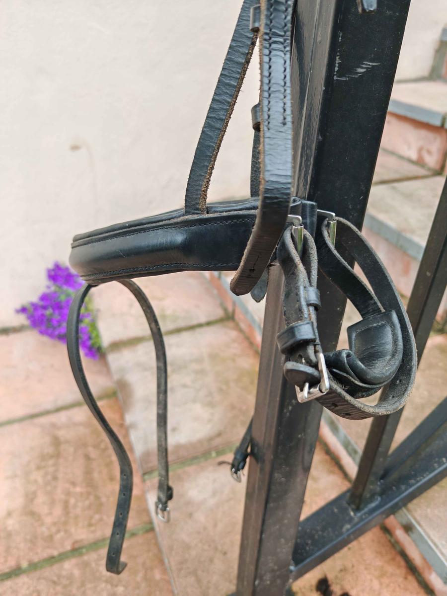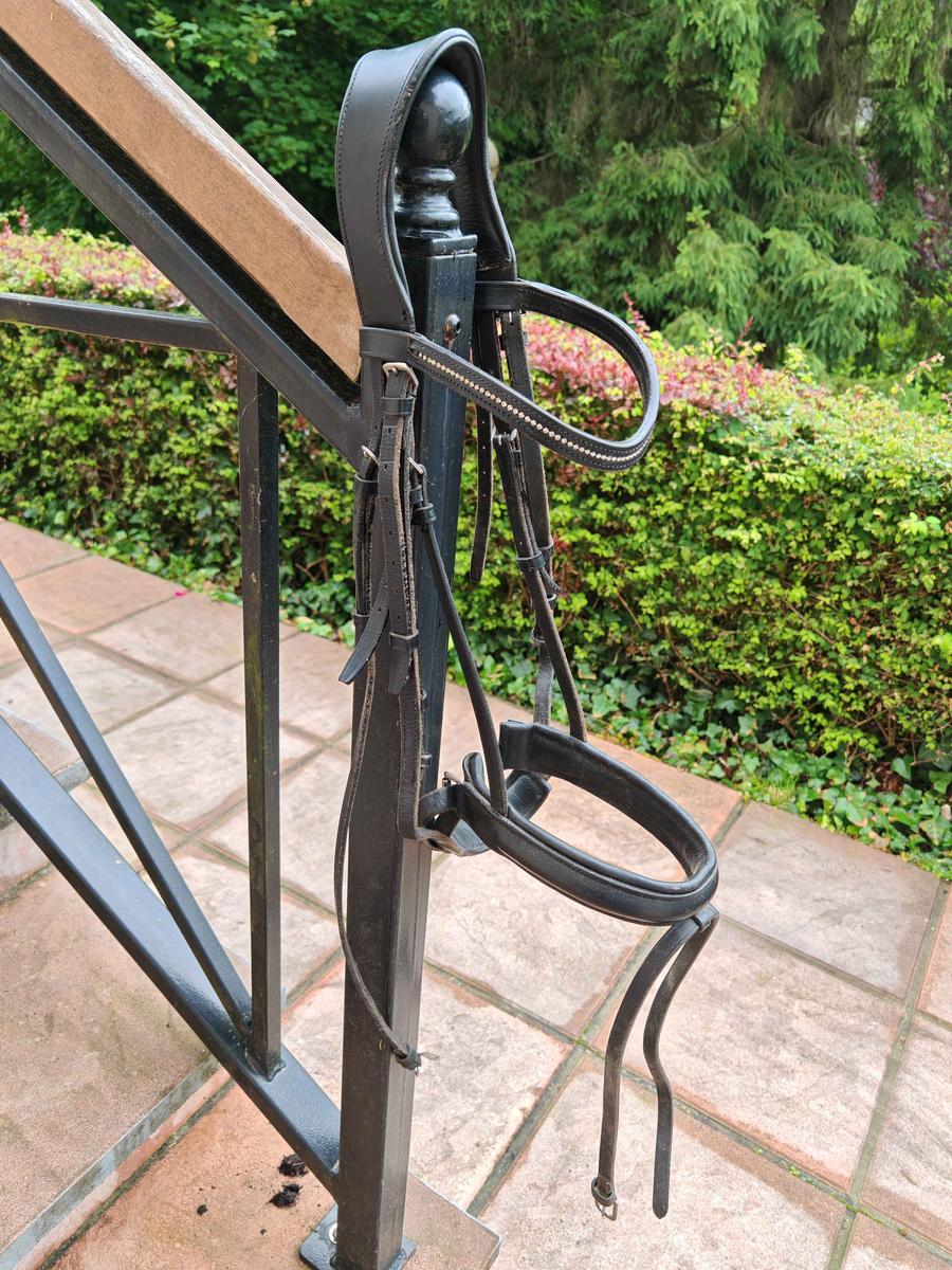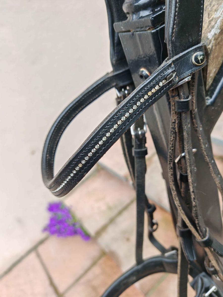 Bridon JMR cheval noir avec frontal strass, têtière anatomique et muserolle pull back confort Très bon état, vendu nu