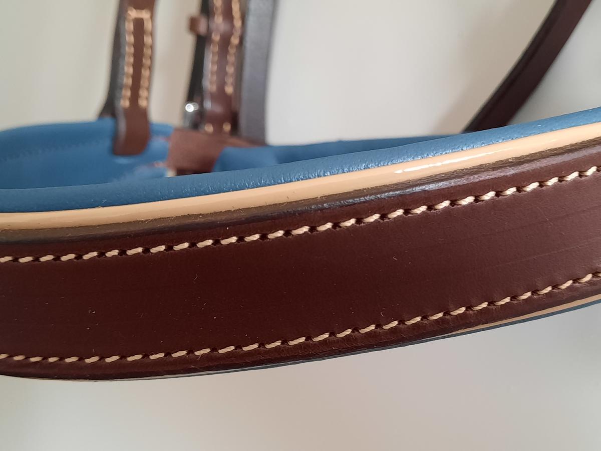 Cuir havane, doublures bleu marine, liserés vernis beige, fil beige, bouclerie inox