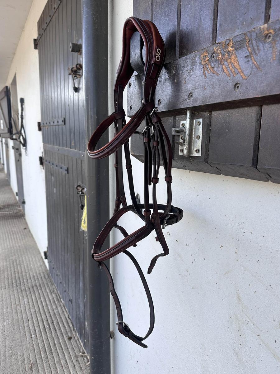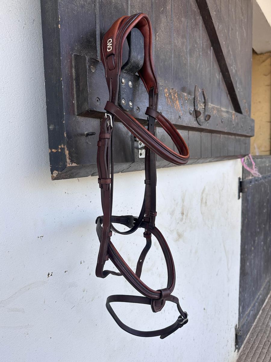 Le bridon anatomique muserolle française conjugue confort et ergonomie. La têtière en mousse à mémoire de forme et la découpe anatomique permettent la diminution des pressions sur le ligament nuchal du cheval.