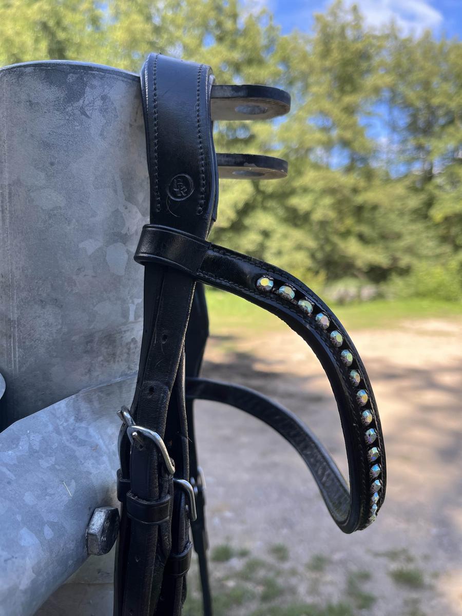 Bridon symétrique en cuir noir de qualité supérieure. La têtière anatomique est rembourrée et sa forme arrondie permet une plus grande liberté derrière les oreilles du cheval. Le frontal courbé est serti des cristaux autrichiens. La sous-gorge est réglable des deux côtés. La sous-gorge et les montants sont en cuir cylindré. La muserolle est en cuir bombée noir et blanc.