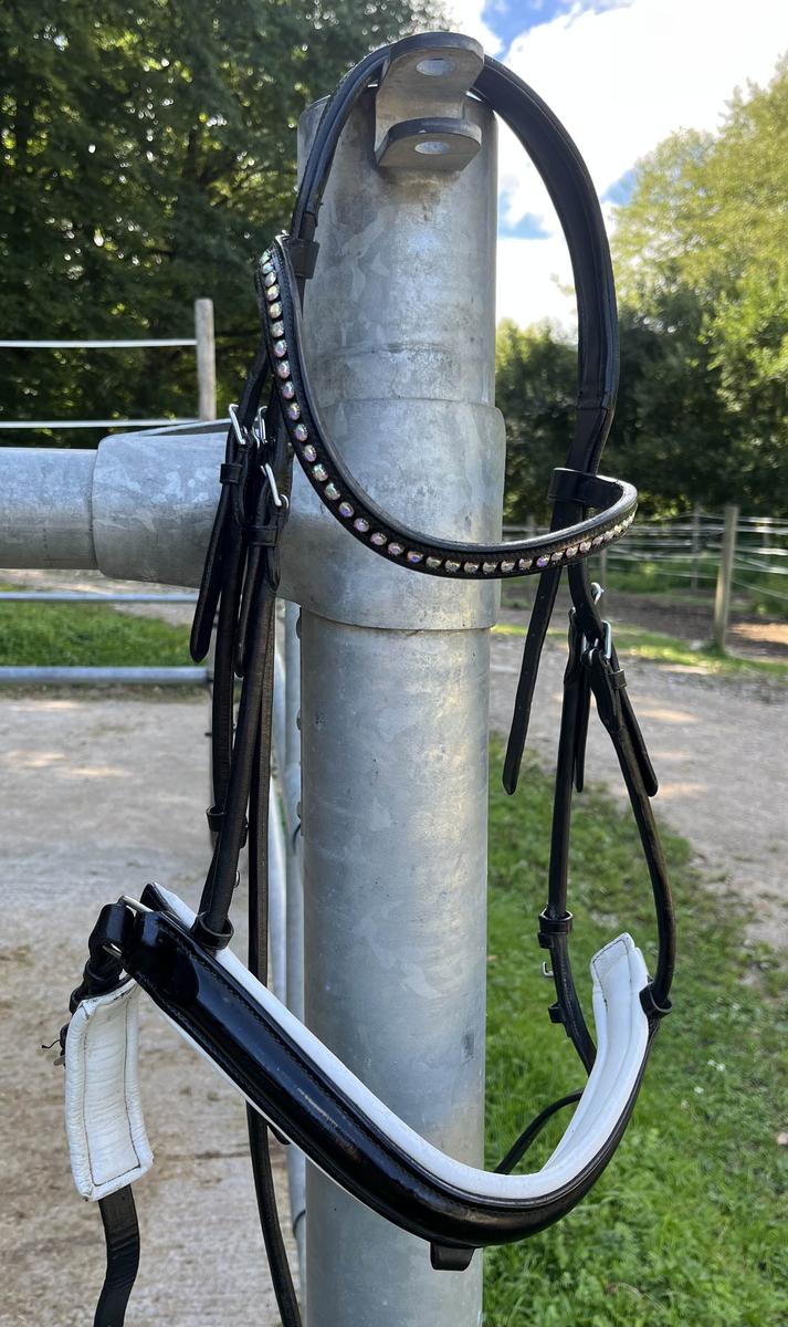 La têtière anatomique est rembourrée et sa forme arrondie permet une plus grande liberté derrière les oreilles du cheval. Le frontal courbé est serti des cristaux autrichiens.