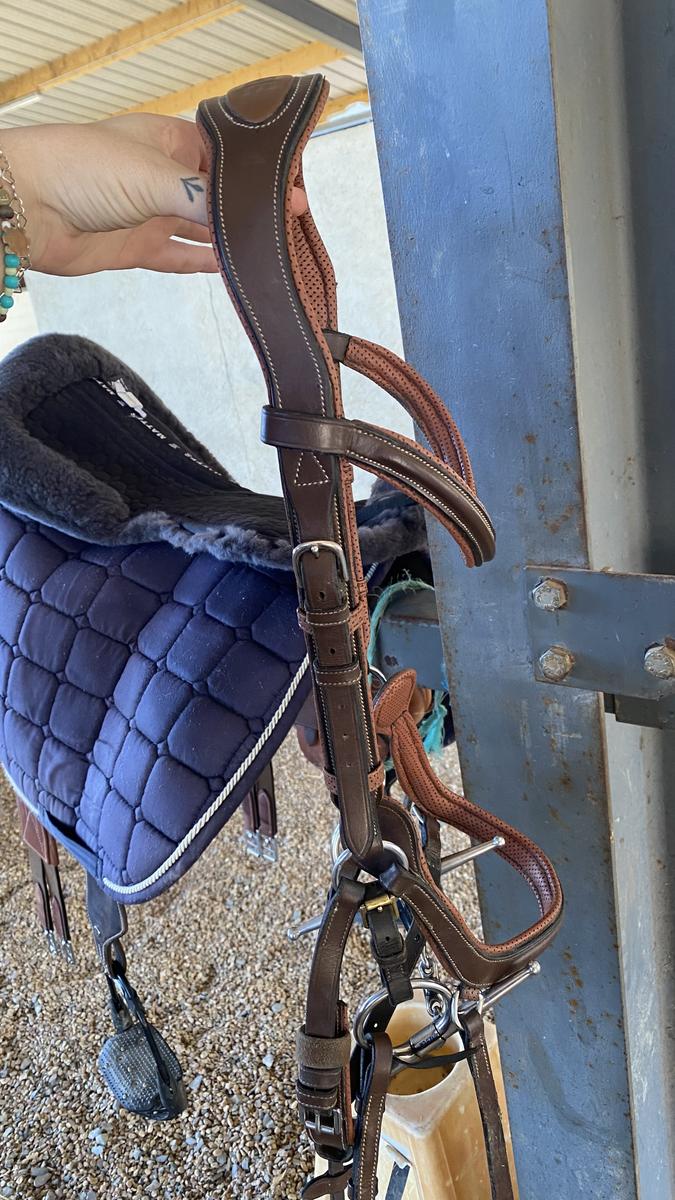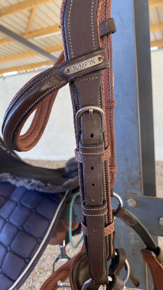 Filet/bridon anatomique Jump’in, couleur noisette, taille cheval. Très bonne état ! Possibilité de vendre avec les rênes, vendu sans mors