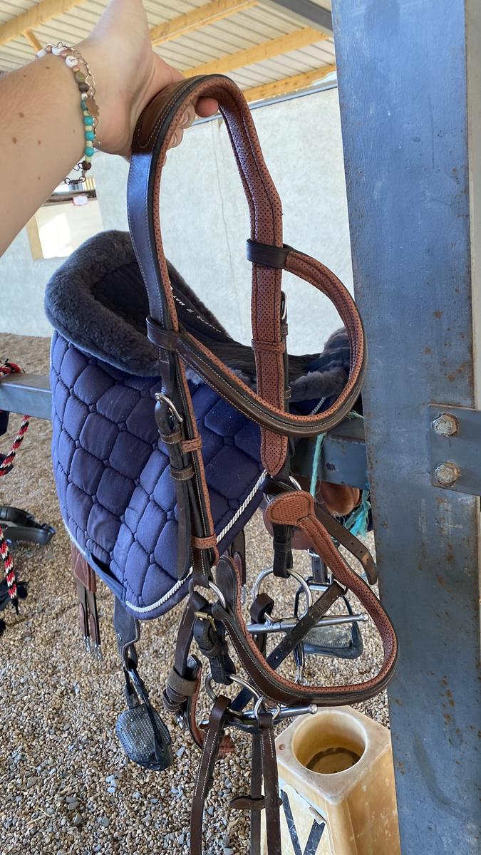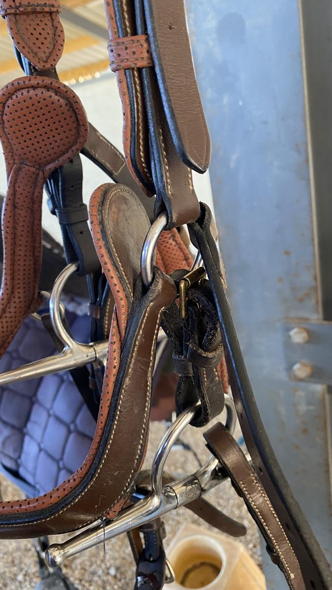Filet/bridon anatomique Jump’in, couleur noisette, taille cheval. Très bonne état ! Possibilité de vendre avec les rênes, vendu sans mors