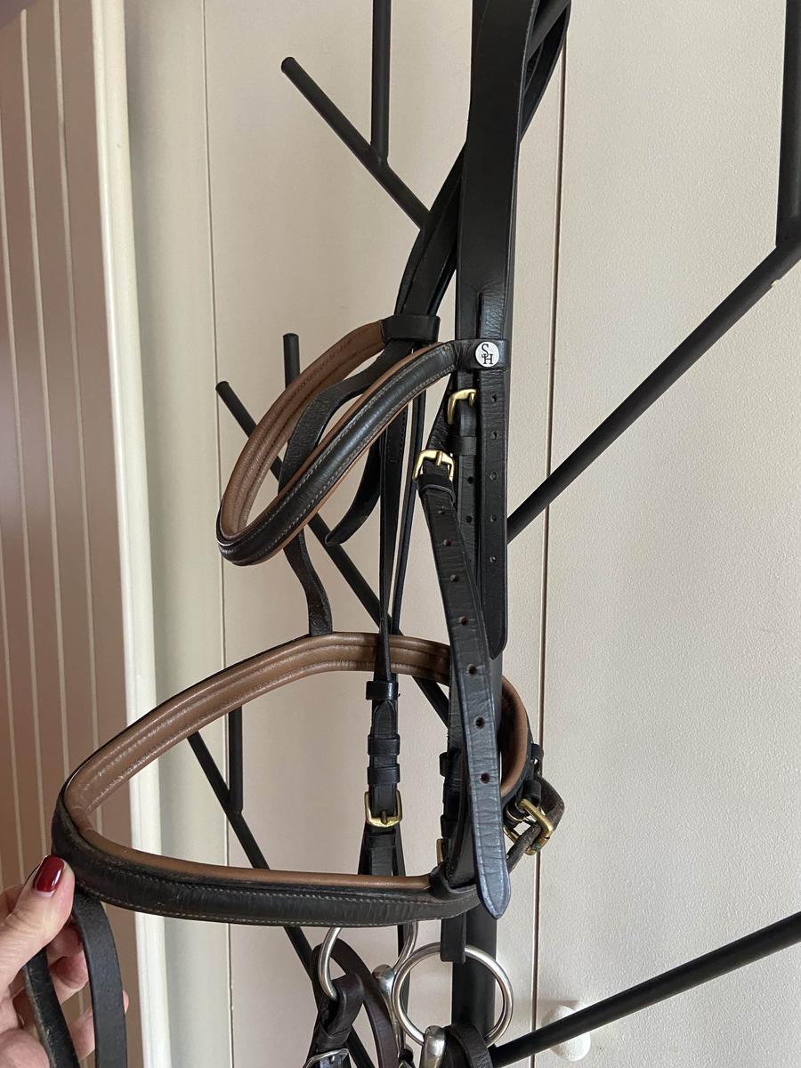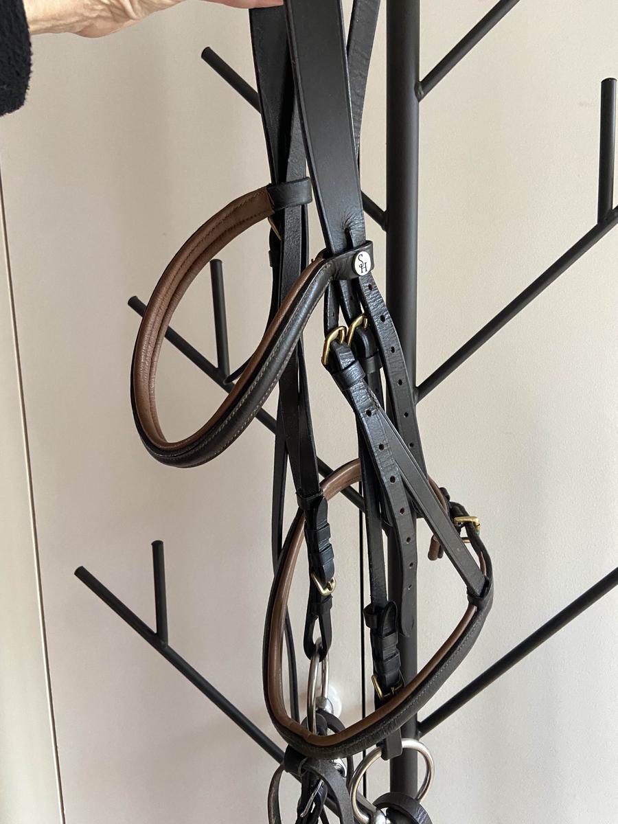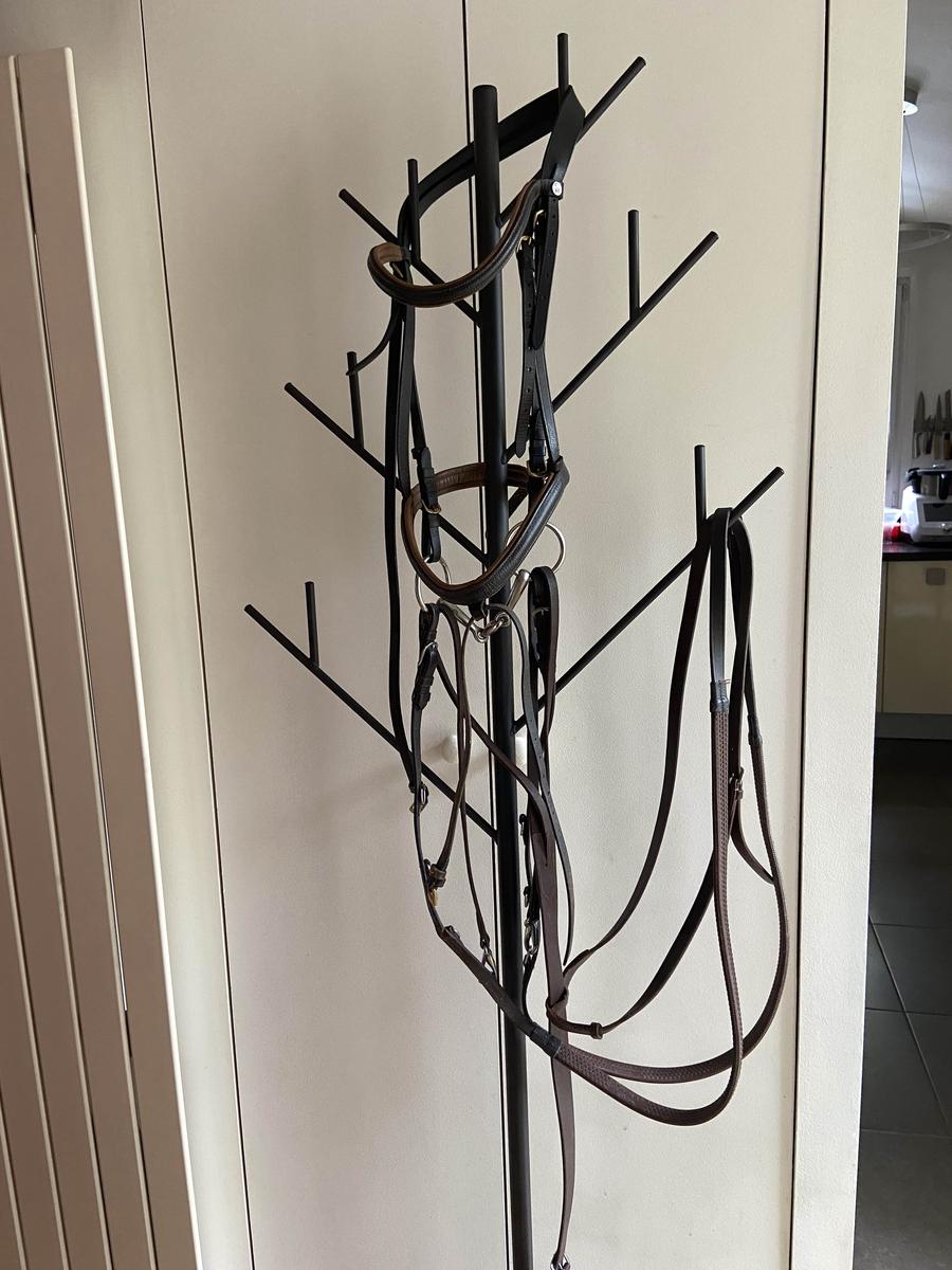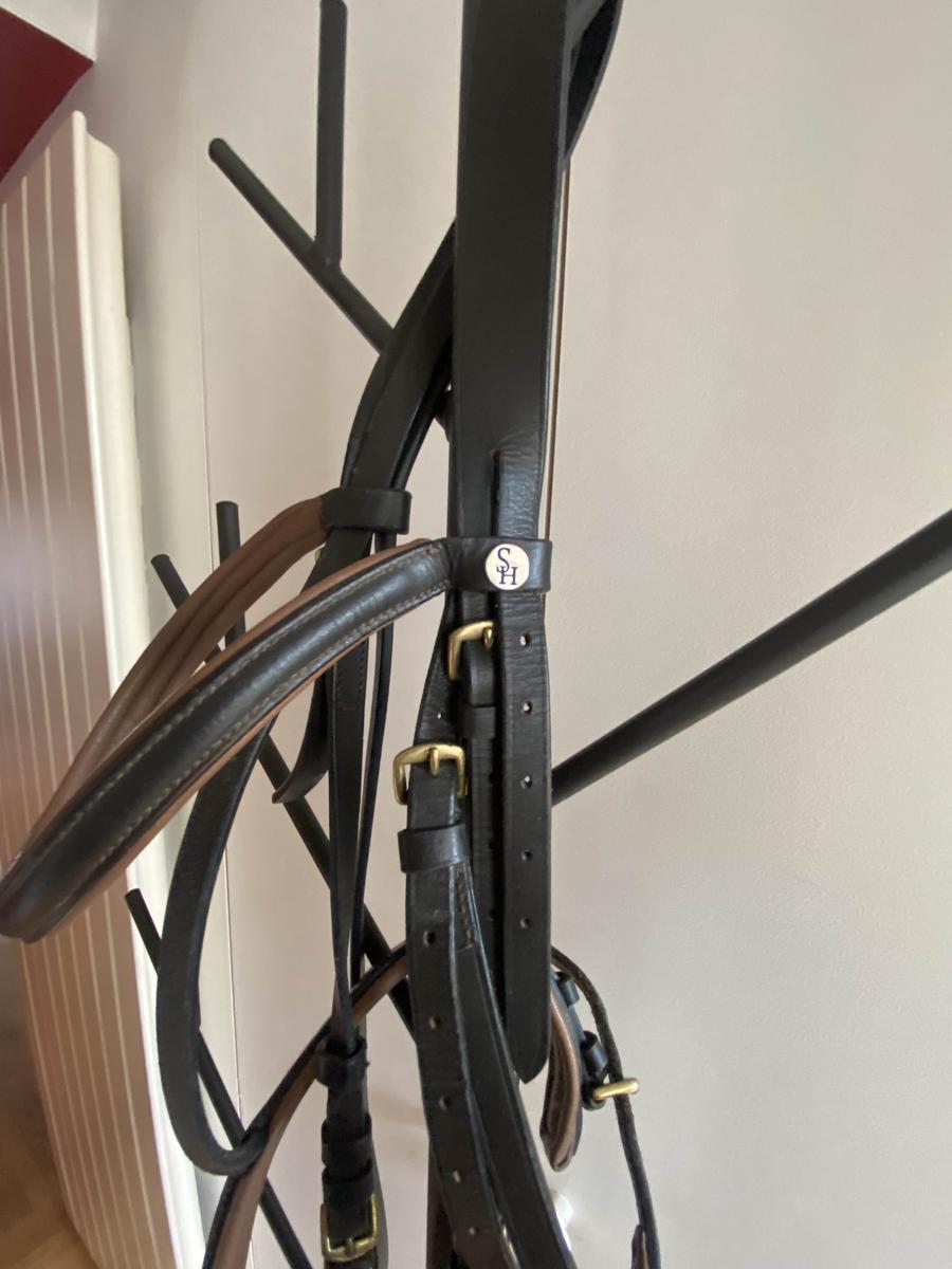 Marque FB (Kramer) en excellent état. Cuir marron foncè, souple, muserole et têtière ergonomique( rembourrées) Noseband amovible.